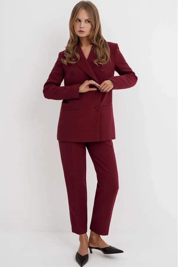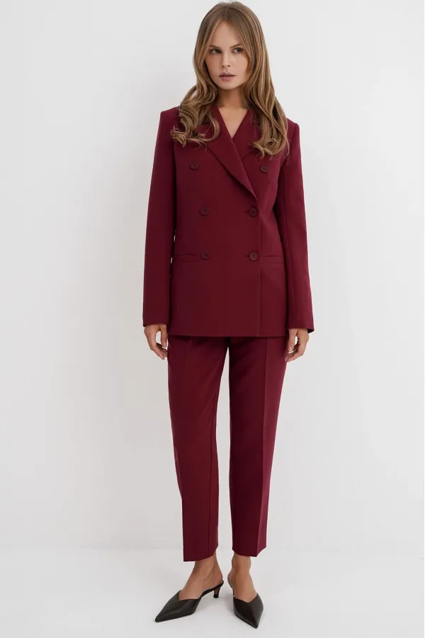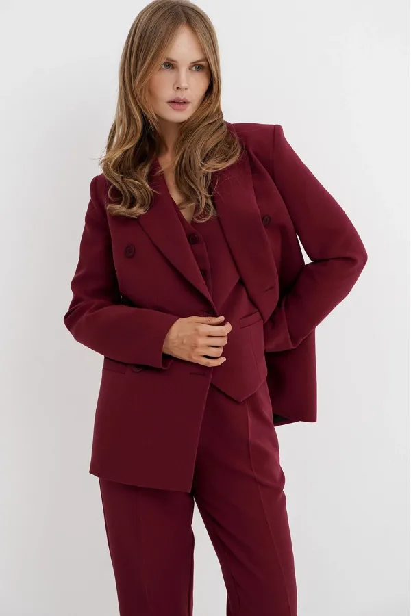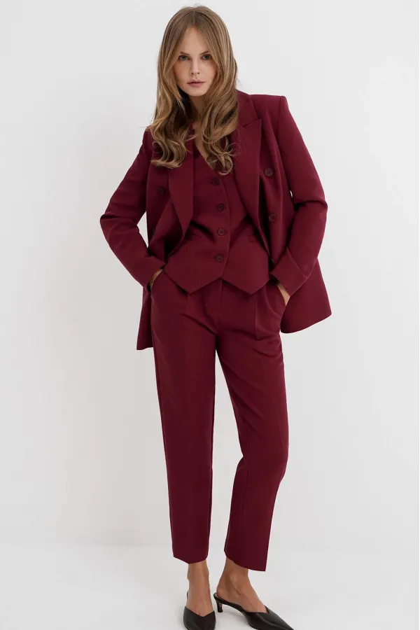 Текстильный костюм-тройка из двубортного жакета, полуприлегающего жилета и укороченных брюк со средней посадкой.