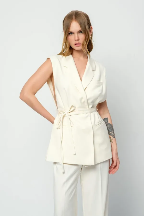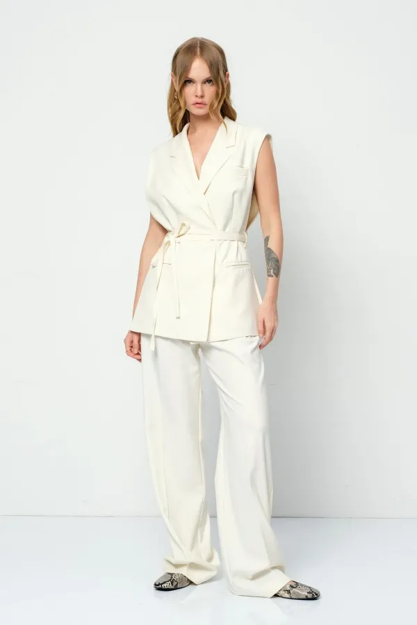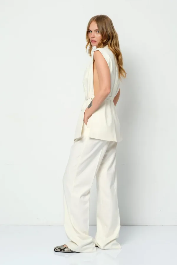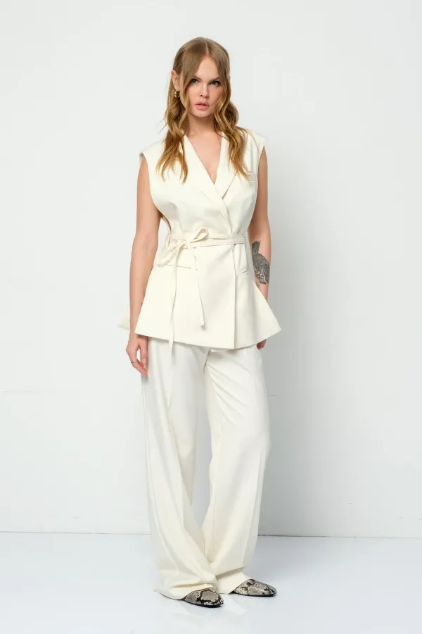 Костюм-двойка из прямого жилета и широких брюк со стрелками. Детали: жилет прямого силуэта, талиевые вытачки переда и спинки, пиджачный воротник, застежка на пришивные кнопки, спинка со средним швом и шлицей, функциональные карманы, жилет на подкладке, в комплекте пояс из основной ткани и чёрный пояс-шнурок из кожзама. Брюки с высокой посадкой, притачной пояс со шлевками, передние половины с небольшими застроченными мягкими складками и заутюженными стрелками, застежка на молнию и пуговицу, боковые карманы. Задние части брюк с вытачками и заутюженными стрелками. Пояс брюк прямой, без резинки. Длина жилета по спинке около 69 см в размерах 40-46 и около 71 см в размерах 48-52. Длина брюк по боковому шву с поясом около 114 в размерах 40-46 и около 115,5 см в размерах 48-52. Длина по внутреннему шву около 83 см