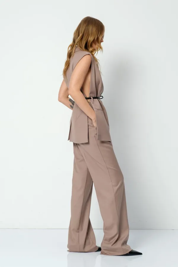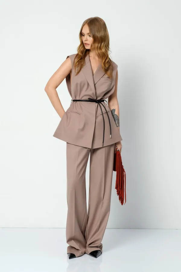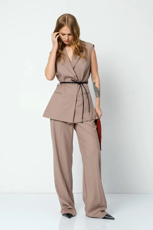 Костюм-двойка из прямого жилета и широких брюк со стрелками. Детали: жилет прямого силуэта, талиевые вытачки переда и спинки, пиджачный воротник, застежка на пришивные кнопки, спинка со средним швом и шлицей, функциональные карманы, жилет на подкладке, в комплекте пояс из основной ткани и чёрный пояс-шнурок из кожзама. Брюки с высокой посадкой, притачной пояс со шлевками, передние половины с небольшими застроченными мягкими складками и заутюженными стрелками, застежка на молнию и пуговицу, боковые карманы. Задние части брюк с вытачками и заутюженными стрелками. Пояс брюк прямой, без резинки. Длина жилета по спинке около 69 см в размерах 40-46 и около 71 см в размерах 48-52. Длина брюк по боковому шву с поясом около 114 в размерах 40-46 и около 115,5 см в размерах 48-52. Длина по внутреннему шву около 83 см