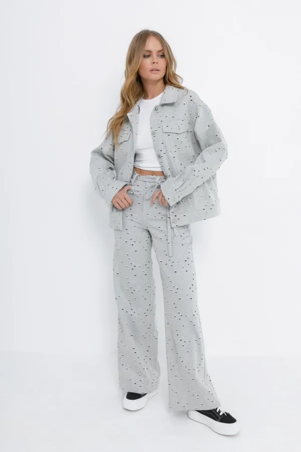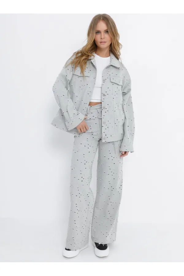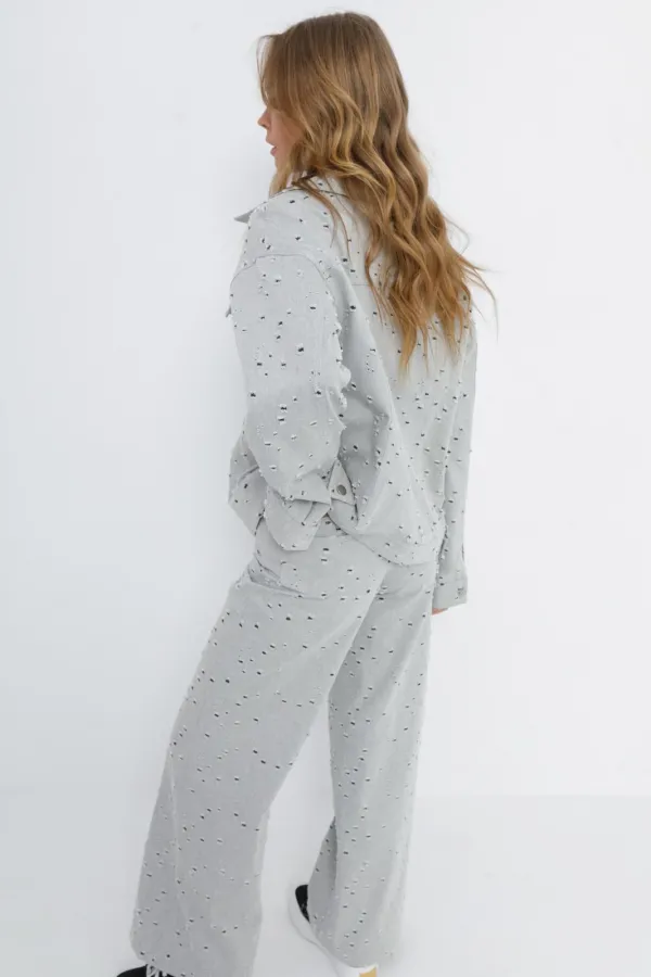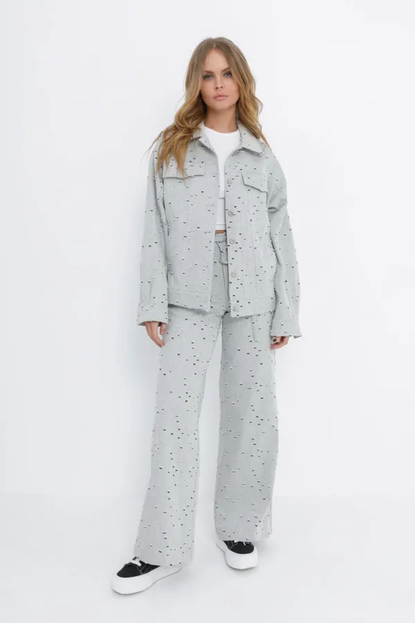 Костюм-двойка из свободной куртки-рубашки и широких брюк из хлопкового джинса с перфорацией.