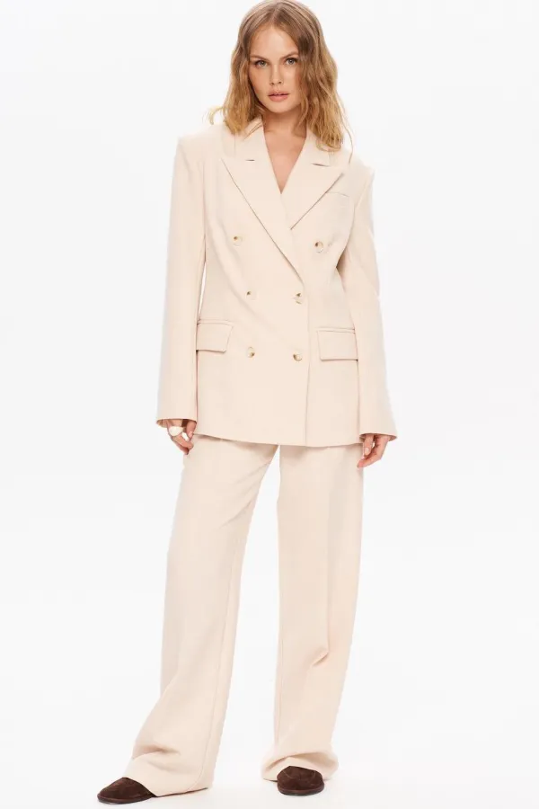 Текстильный костюм-двойка из свободного жакета и прямых широких брюк со стрелками. Детали: жакет свободного покроя и полуприлегающего силуэта, двубортная застежка на петли и пуговицы, отрезные бочки, пиджачный воротник, ... Читать далее...