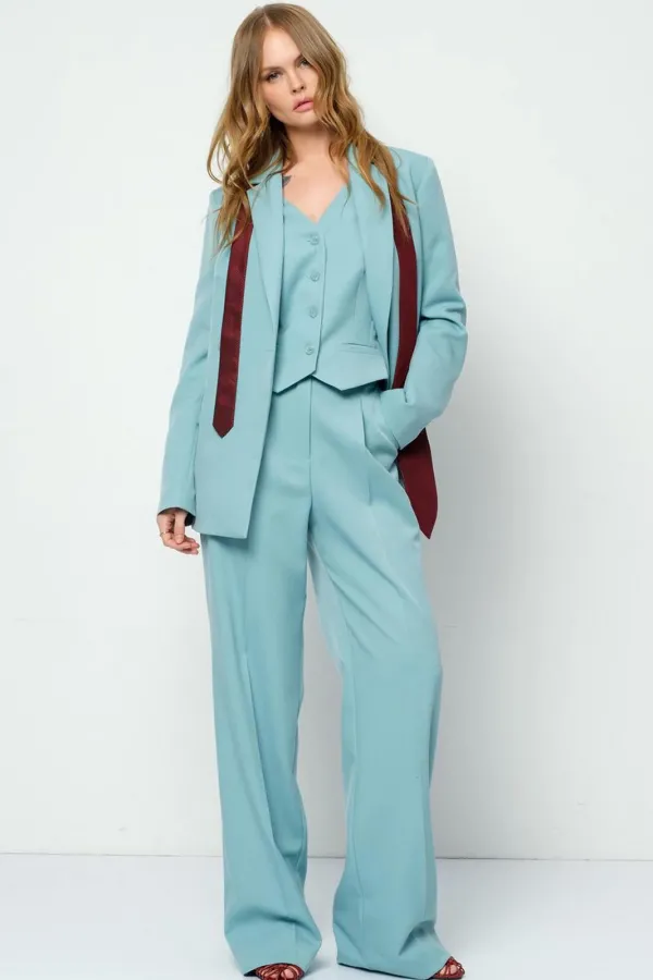 Костюм-двойка из двубортного полуприлегающего жакета и прямых широких брюк со стрелками.