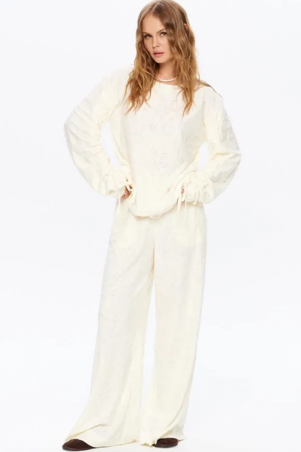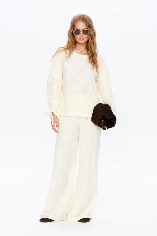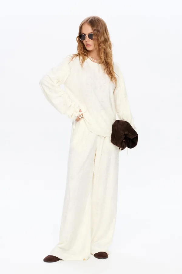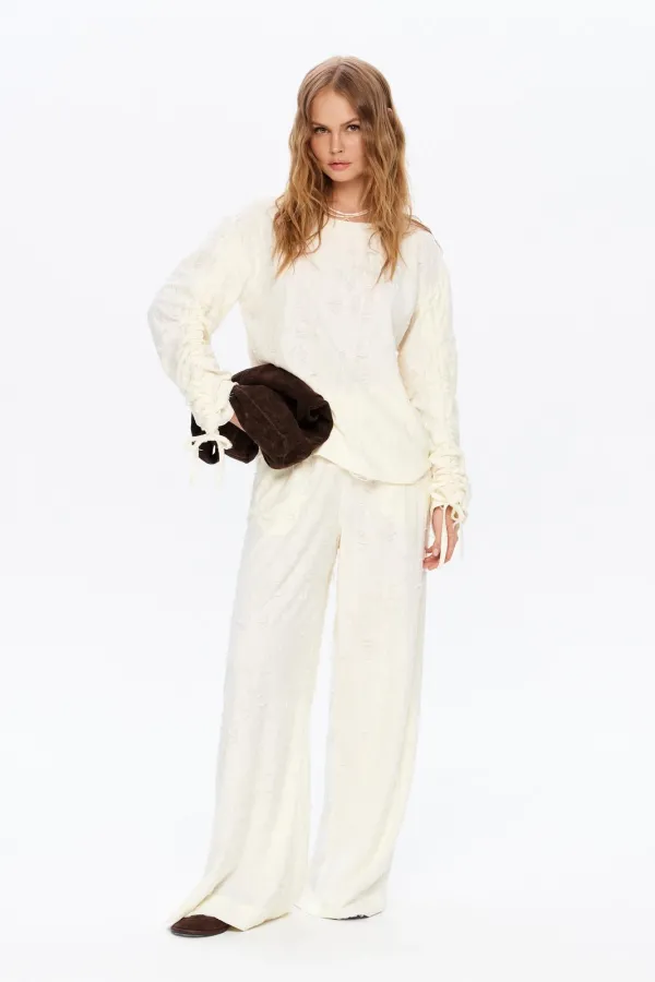 Комплект-двойка из свободного свитшота с объемными рукавами и широких брюк из фактурного трикотажа.