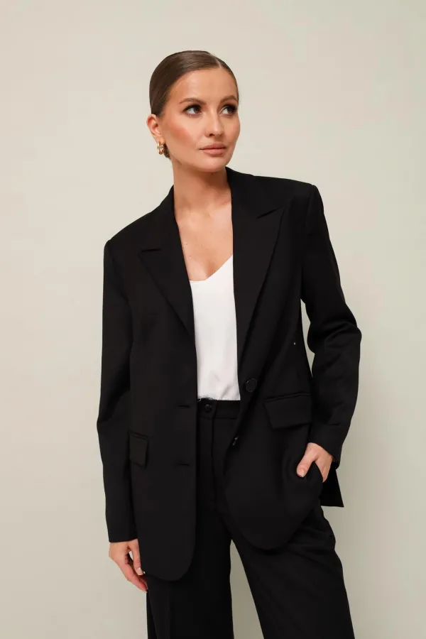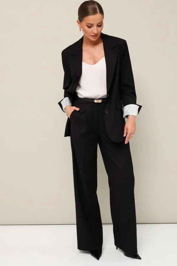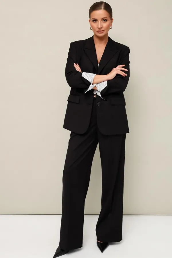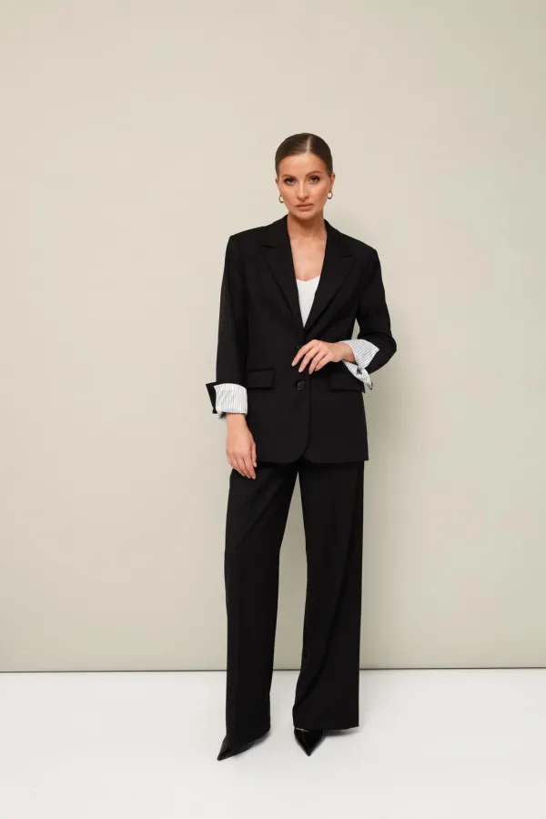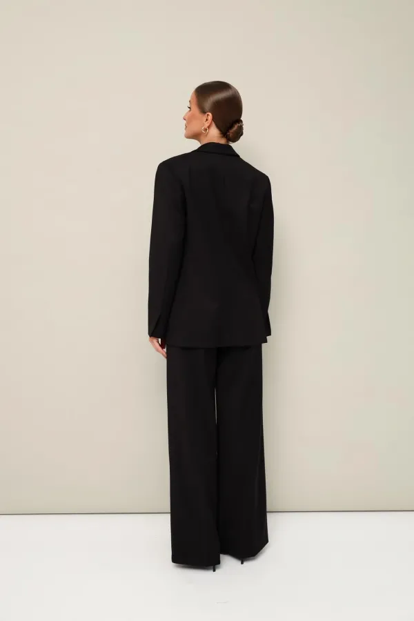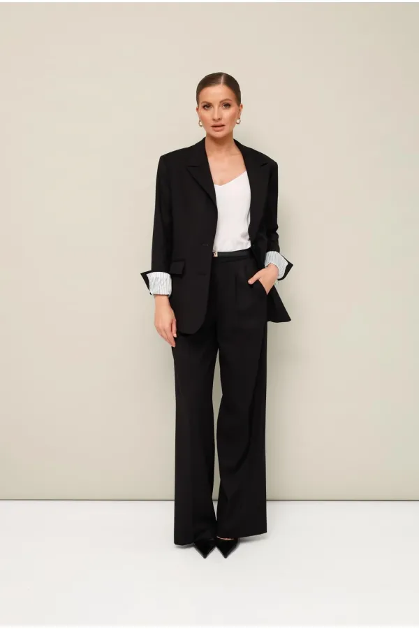 Стильный 2-предметный комплект, состоящий из жакета и брюк, выполнен из качественной костюмной ткани.