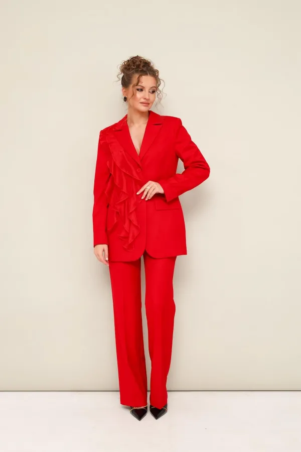 Жакет полуприлегающего силуэта, с центральной застежкой на петли и пуговицы. Воротник пиджачного типа с отложными лацканами, край борта скругленный по низу жакета. Спереди прорезной карман в рамку с клапаном. По правой полочке обработан декоративный элемент в виде настрочных воланов. Рукава втачные, двухшовные с вытачными шлицами с пуговицами. Спинка с рельефами и средним швом, переходящим в шлицу. Жакет на подкладке.