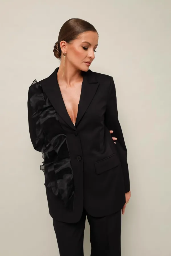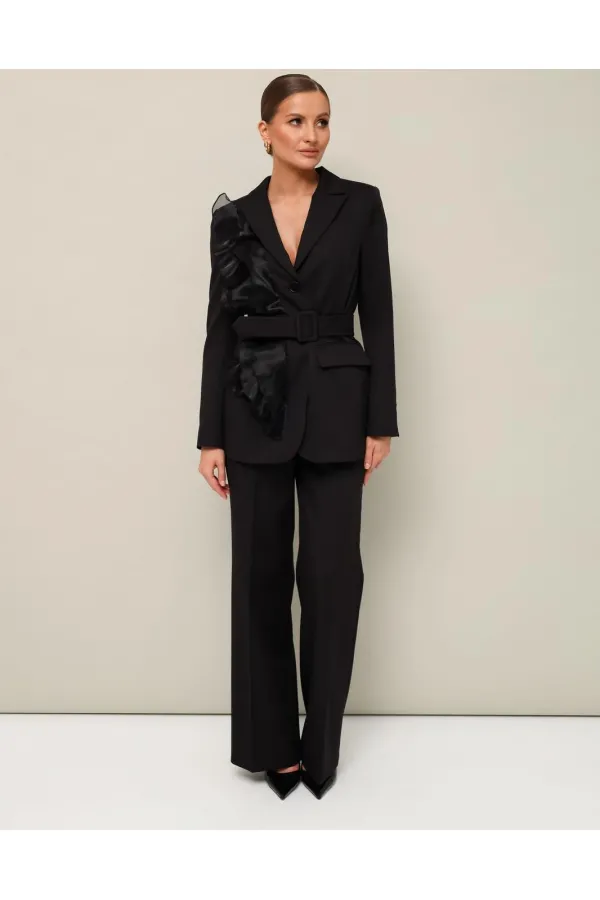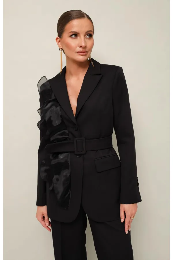 Жакет полуприлегающего силуэта, с центральной застежкой на петли и пуговицы. Воротник пиджачного типа с отложными лацканами, край борта скругленный по низу жакета. Спереди прорезной карман в рамку с клапаном. По правой полочке обработан декоративный элемент в виде настрочных воланов. Рукава втачные, двухшовные с вытачными шлицами с пуговицами. Спинка с рельефами и средним швом, переходящим в шлицу. Жакет на подкладке.