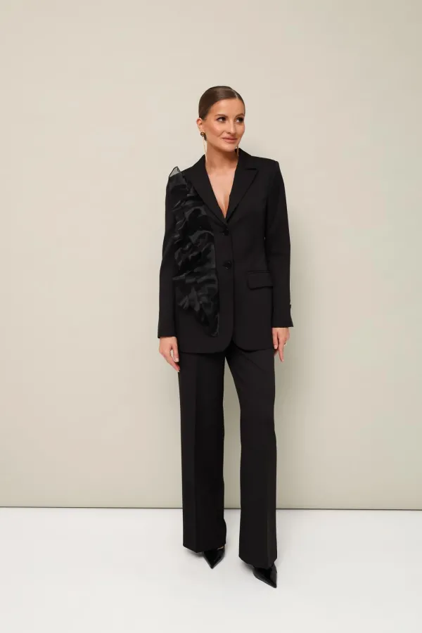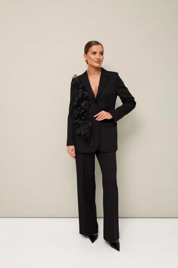 Комплект 2-предметный, состоящий из жакета и брюк, выполненный из костюмной ткани.