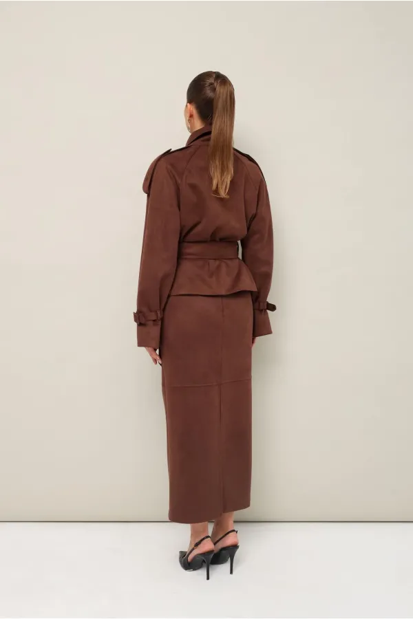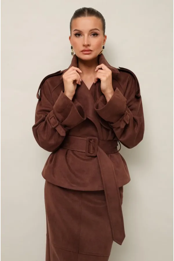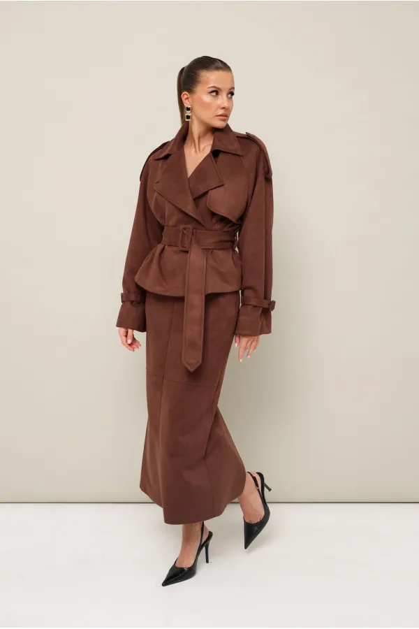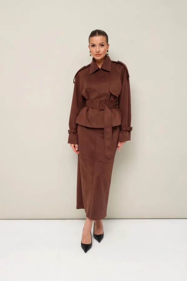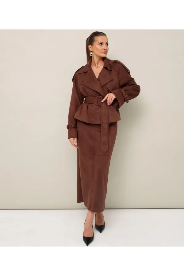 Стильный 2-предметный комплект, состоящий из жакета и юбки, выполненный из экозамши.