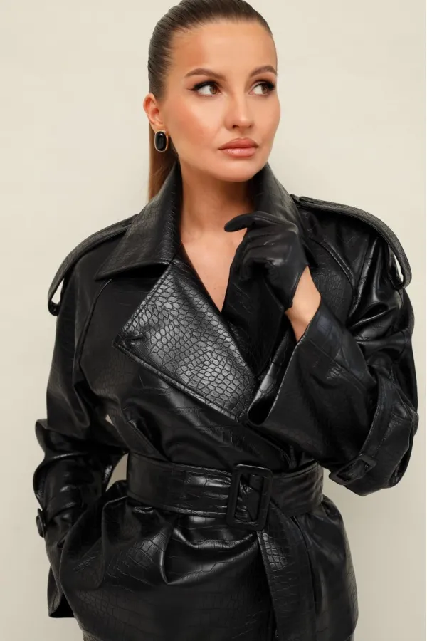 Стильный 2-предметный комплект, состоящий из жакета и юбки, выполненный из экокожи.