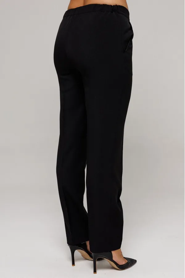 Брюки прямые, заужены к низу, длинные. Карманы с отрезным бочком. Пояс в задней части на резинке. Брюки без застежки. По центру половинок брюк- заутюженная стрелка. Жакет 67 см, рукав 59 см, брюки 101 см.