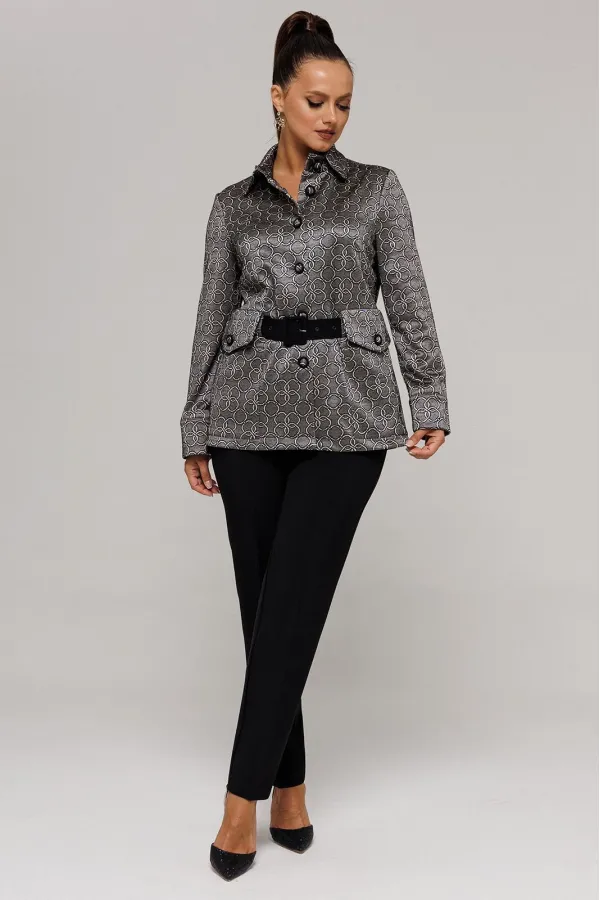 Жакет прямого силуэта, длиной немного ниже линии бедер, рукав длинный, втачной, с широкой бейкой по низу, в которой рисунок ткани расположен по косой. Застежка жакета-до верха, на петли и пуговицы. Воротник со стойкой, отложной. По переду расположены накладные карманы с клапанами. Под клапанами дополнительно имеется частичная кулиска, в которую протягивается ремень, изготовленный из ткани что и боюки. Отделочными строчками дополнены воротник, манжеты, клапаны и карманы жакета.