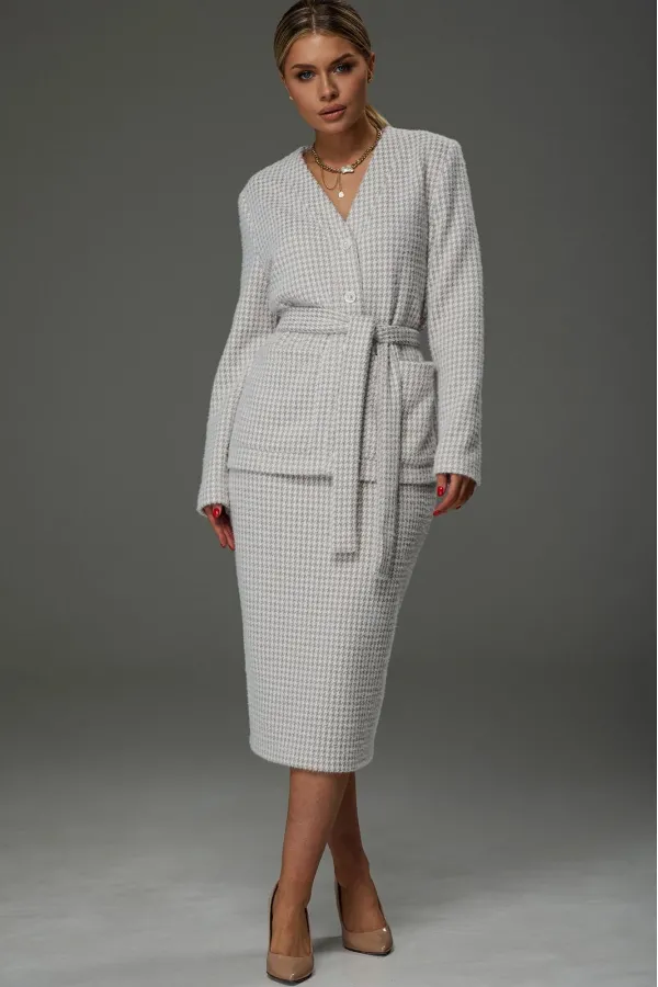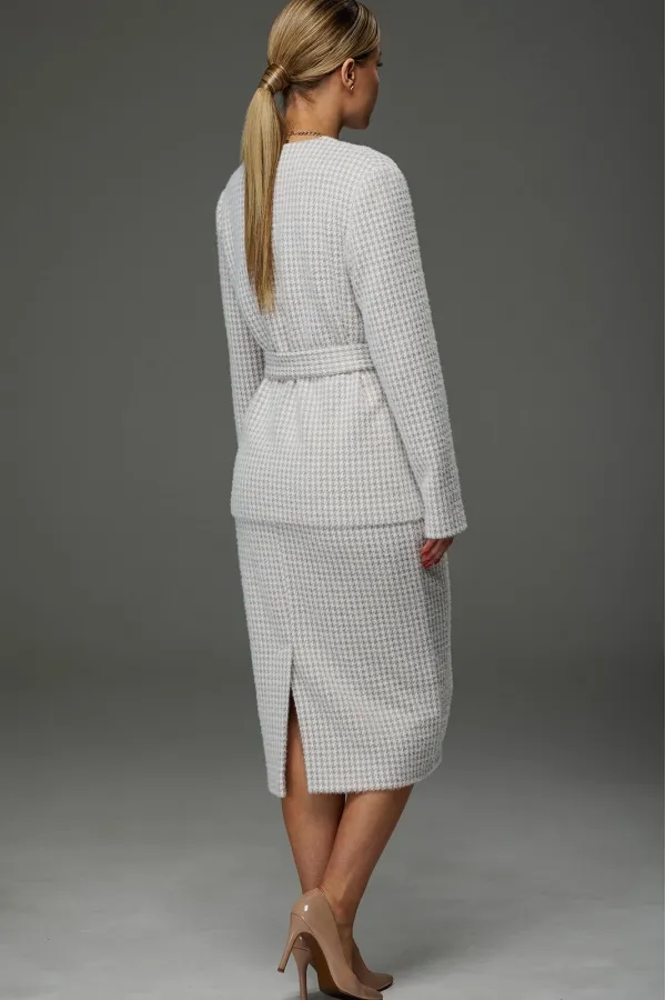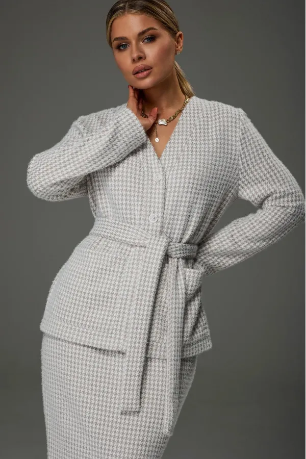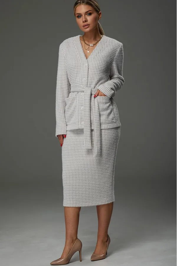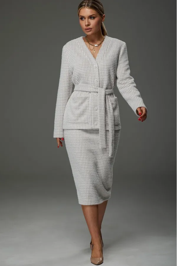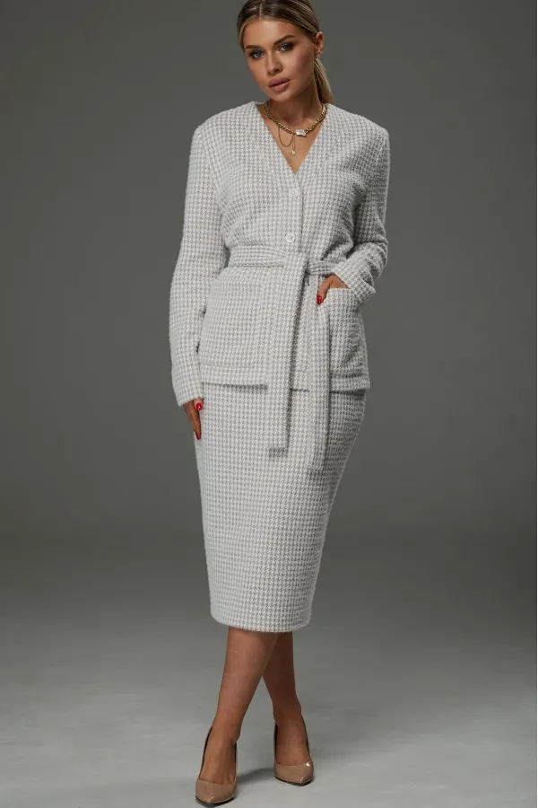 Костюм женский из трикотажной ткани. Жакет имеет V образный вырез. Застёгивается на 5 петель- пуговиц.Спереди накладные карманы. Жакет завязывается на пояс.