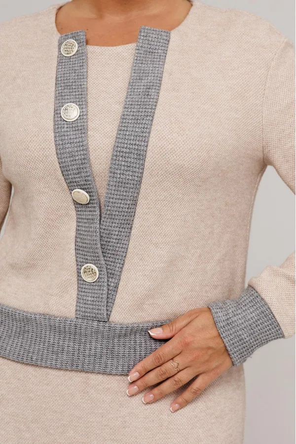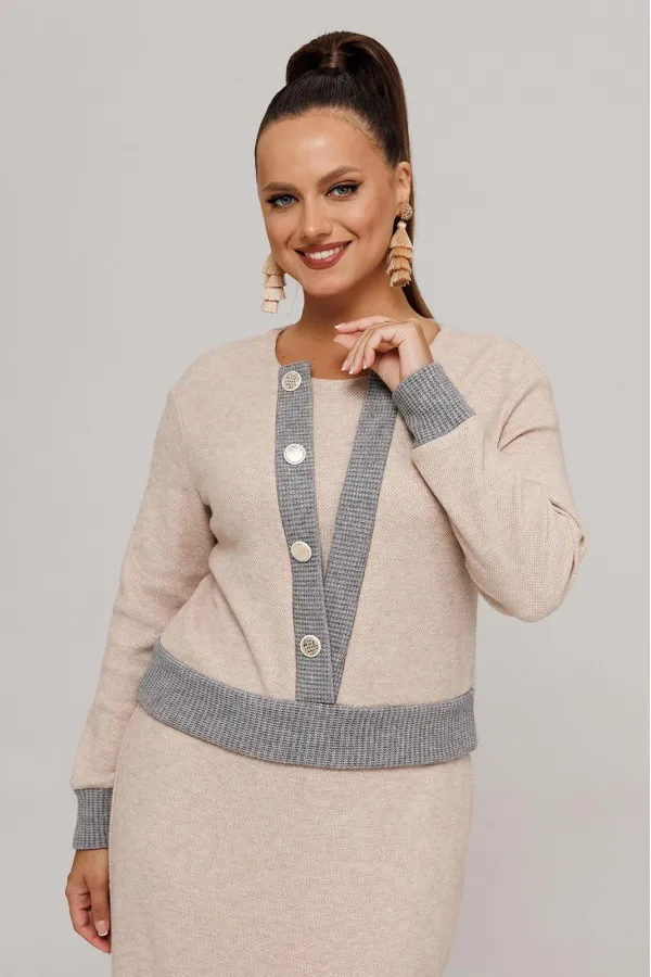 Джемпер прямого силуэта, со спущенным рукавом, по низу рукава и джемпера манжета и планка из вязаного полотна. По переду имеется членение, в которое вставлена планка из вязки, которая создаёт имитацию расстёгнутого джемпера.Декором данного джемпера служат декоративные пуговицы.
