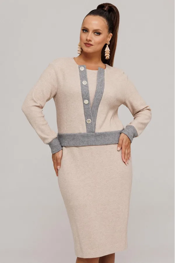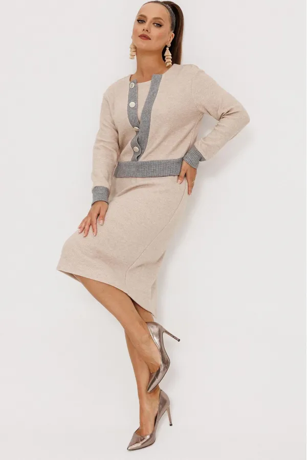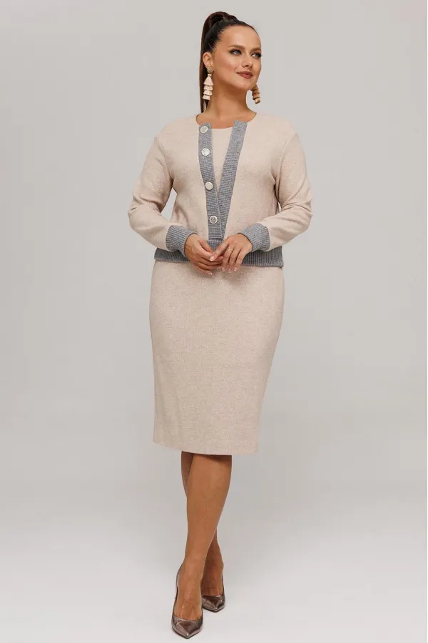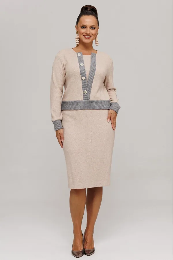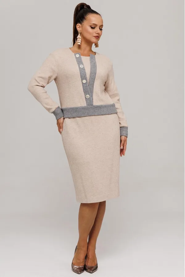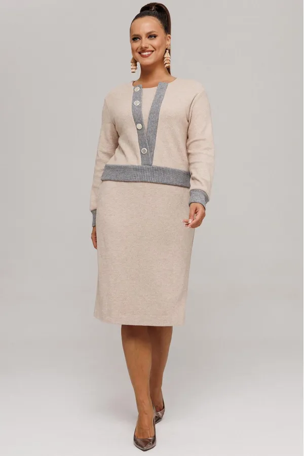 Данные женский костюм состоит из джемпера и юбки, выполнен из качественного трикотажа двух разных фактур, что обеспечивает прекрасный стиль и комфорт.Джемпер прямого силуэта, со спущенным рукавом, по низу рукава и джемпе... Читать далее...