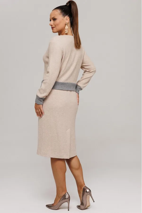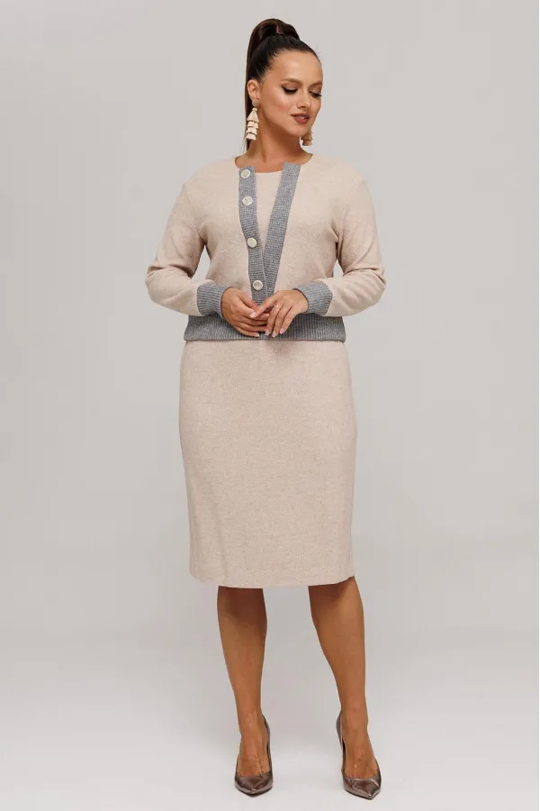 Данные женский костюм состоит из джемпера и юбки, выполнен из качественного трикотажа двух разных фактур, что обеспечивает прекрасный стиль и комфорт.