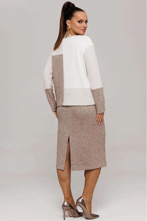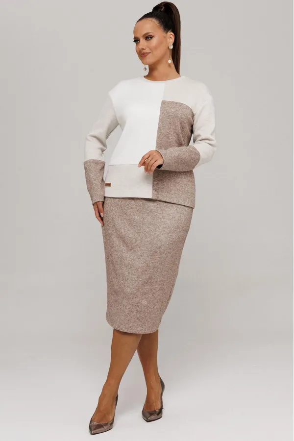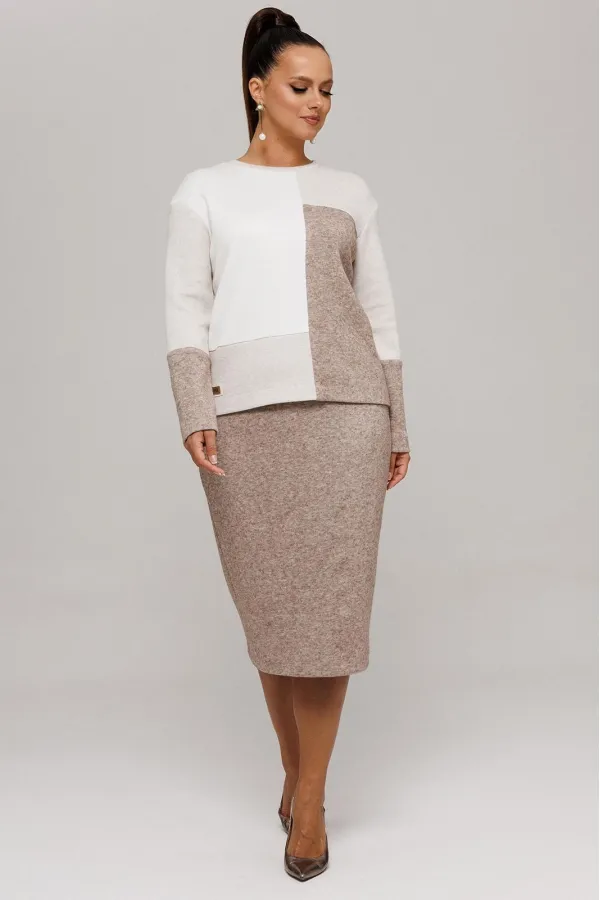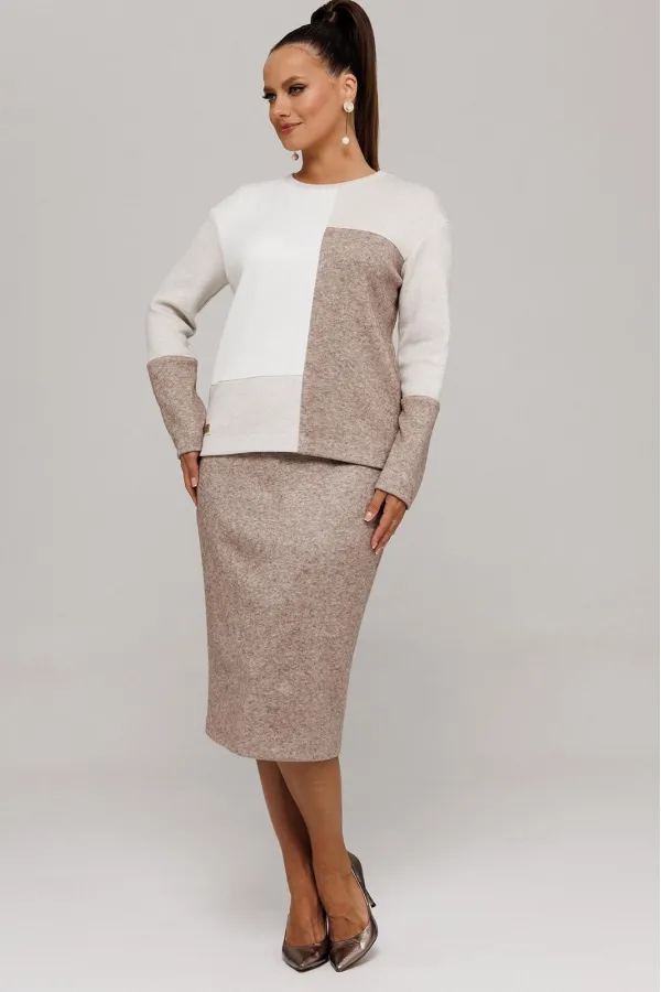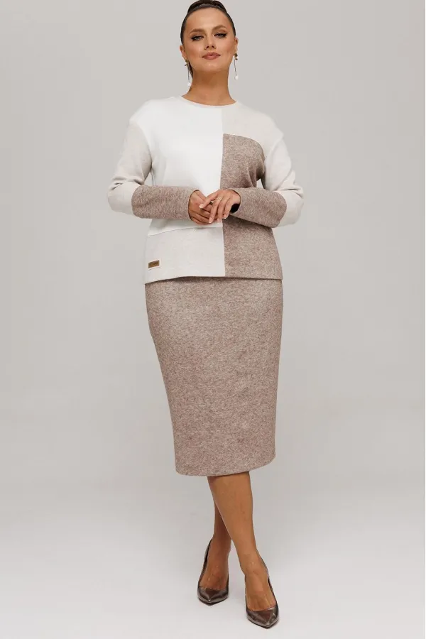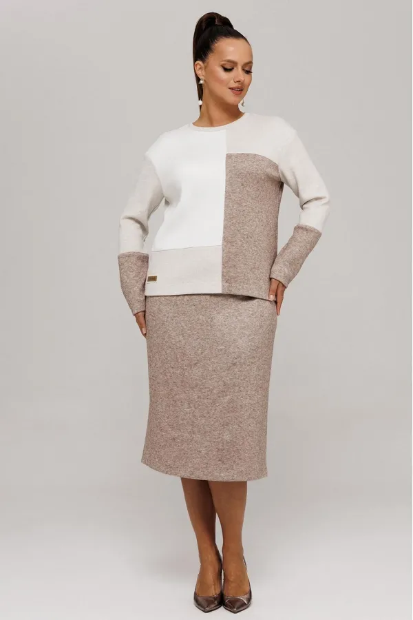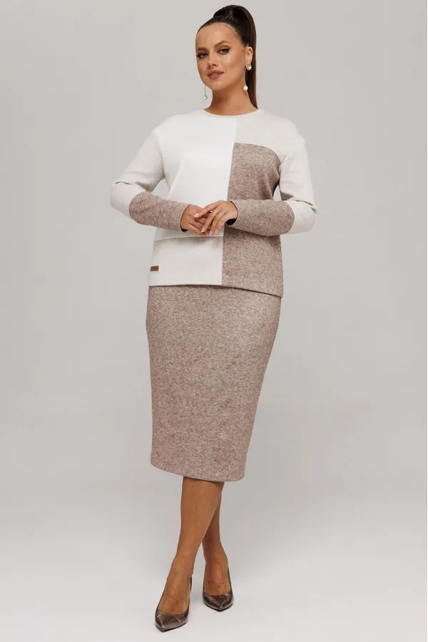Идеальный демисезонный костюм для осени, выполнен из высококачественного трикотажа в сочетании разных цветов одной фактуры.Мягкий трикотаж с плотной фактурой придает образу винтажный шарм, а натуральные материалы обеспечивают причиные тактильные ощущения течение всего дня.Джемпер прямого силуэта, со спущенным рукавам, имеет дизайнерские членения по переду и рукавам.Горловина обработана планкой.