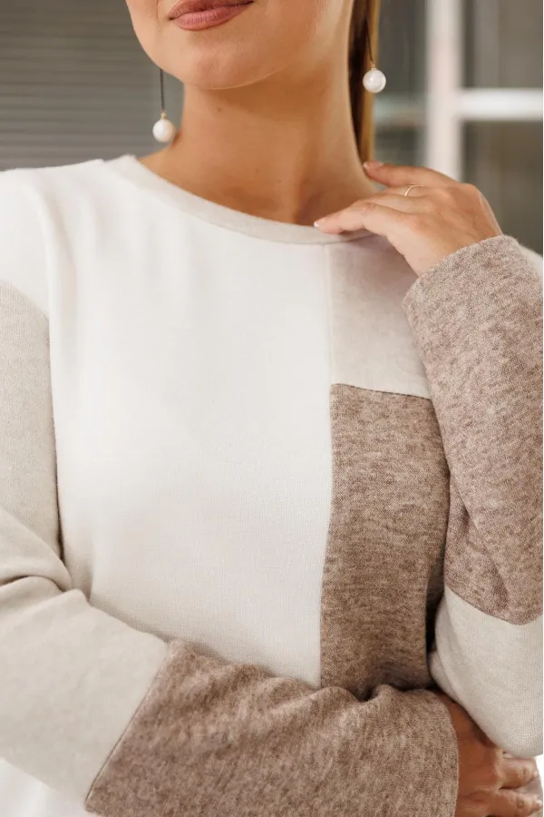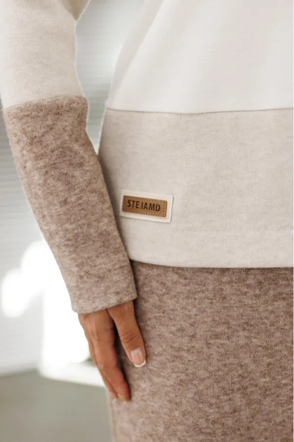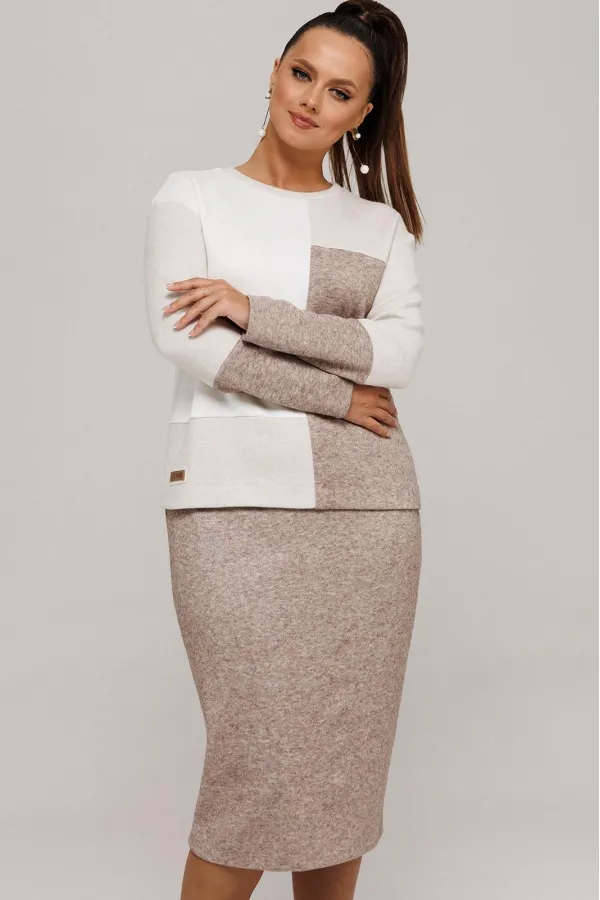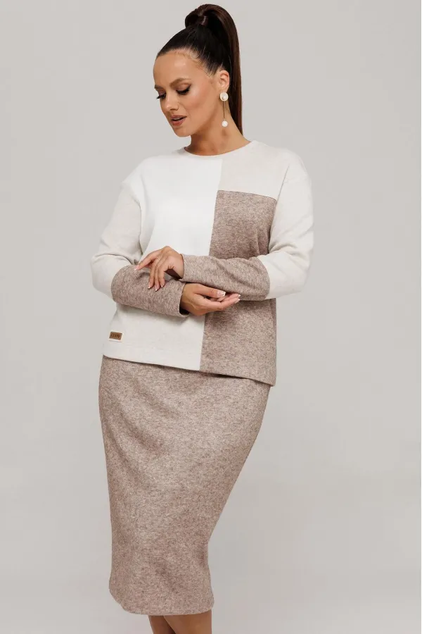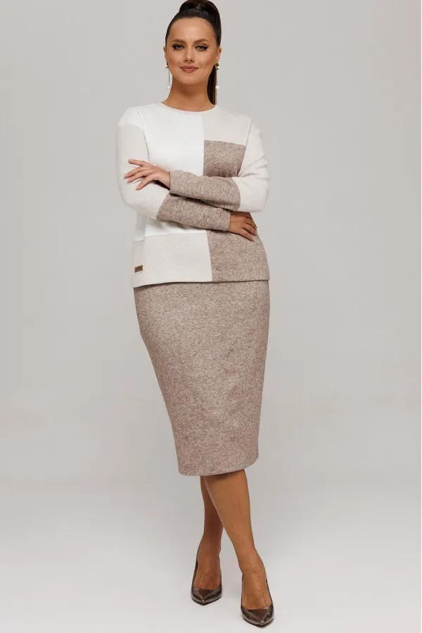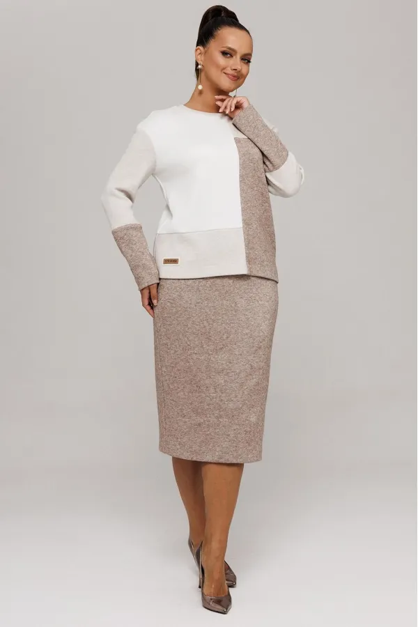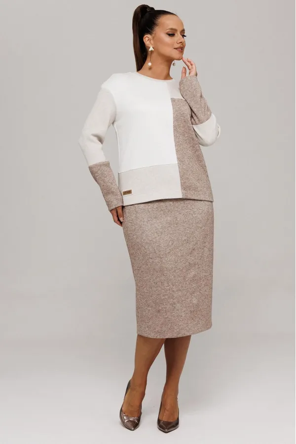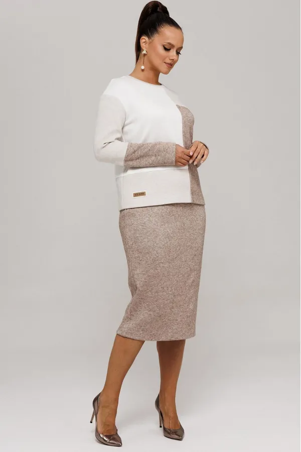Идеальный демисезонный костюм для осени, выполнен из высококачественного трикотажа в сочетании разных цветов одной фактуры.Мягкий трикотаж с плотной фактурой придает образу винтажный шарм, а натуральные материалы обеспечивают причиные тактильные ощущения течение всего дня.Джемпер прямого силуэта, со спущенным рукавам, имеет дизайнерские членения по переду и рукавам.Горловина обработана планкой.