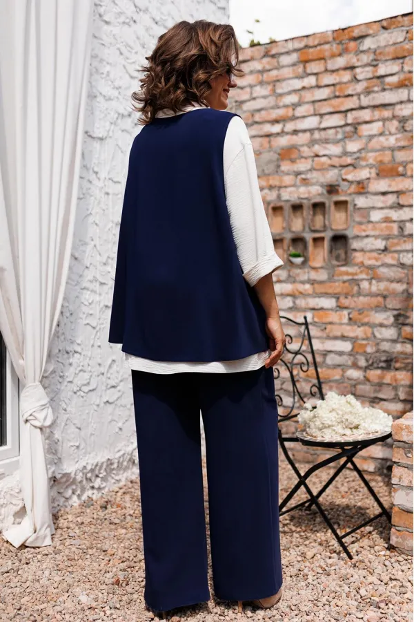 Комплект женский, предназначен для повседневной носки. Комплект 3-х предметный жилет, брюки и блузка. Жилет женский, слегка расширен к низу, с фигурным низом и фигурными разрезами. Перед с 2-мя притачными бочками. Спинка цельнокроеная. Горловина круглая, обтачная, без воротника. Проймы фигурные, обточные. Блузка женская, прямого силуэта. Перед с 2-мя фигурными притачными бочками, с 2-мя приточными вертикальными планками от горловины. Спинка цельнокроеная. Горловина круглая с втачным воротником рубашечного типа с отрезной стойкой. Застёжка на 6-ть обмётанных петель м 6-ть пришивных пуговиц. Блузка со спущенным плечом. Рукав втачной, одно шовный, длиной 3/4 с притачной отложной манжетой. Блузка без плечевых накладок. Брюки женские прямые длинные. Передние половинки с карманами в боковых швах. Задние половинки с талиевыми вытачками. Брюки с притачным поясом, собранным на эластичную тесьму, закреплённую 2-мя отделочными строчками. Длина спинки жакета 71 см, ширина спинки 38,5 см. ширина плеча 7,5см. Длина боюк по боковому срезу 104 см. Длина спинки блузки 78 см. ширина спинки 48,5 см. длина рукава от горловины 37 см.