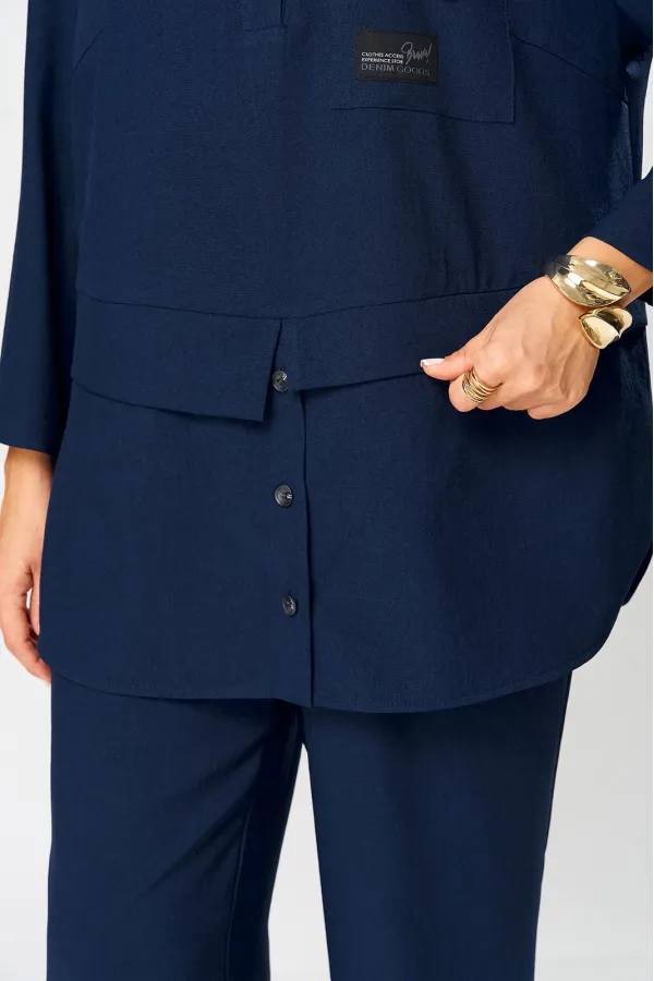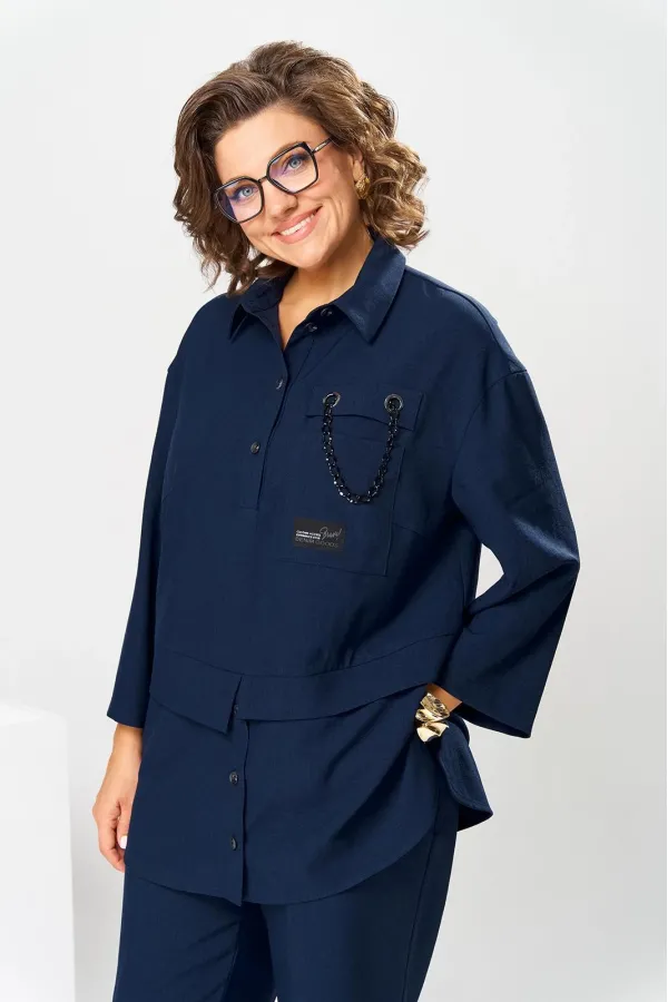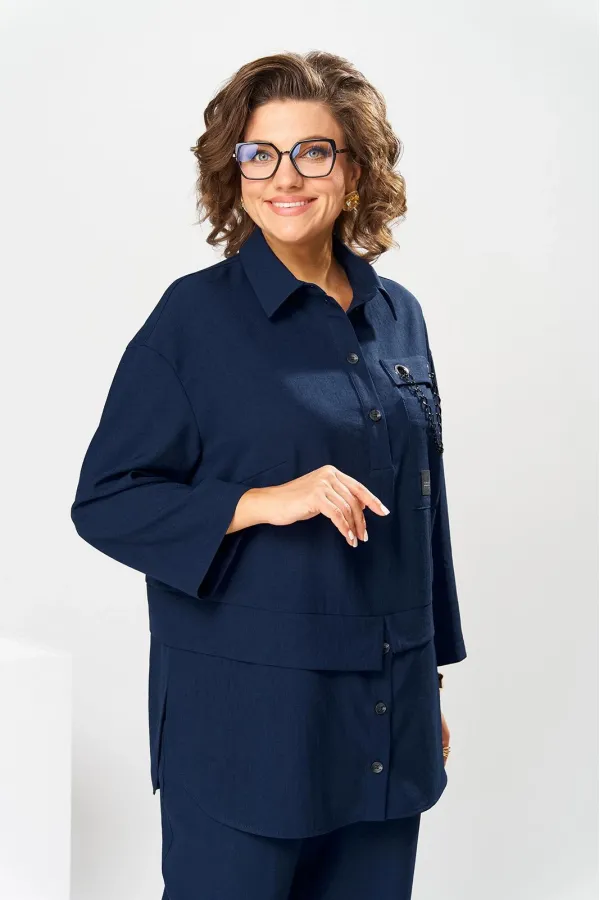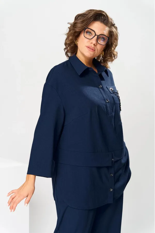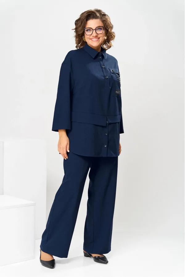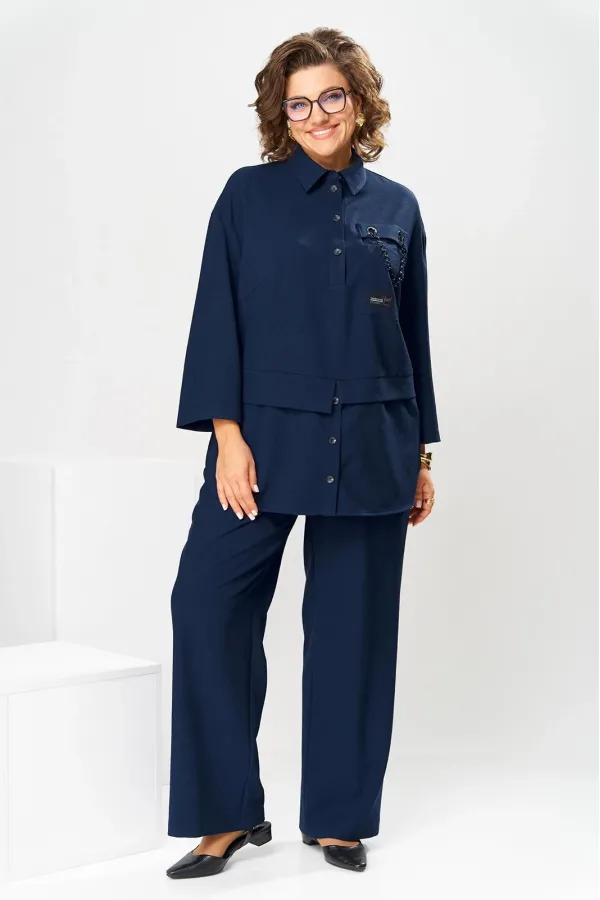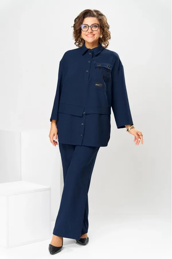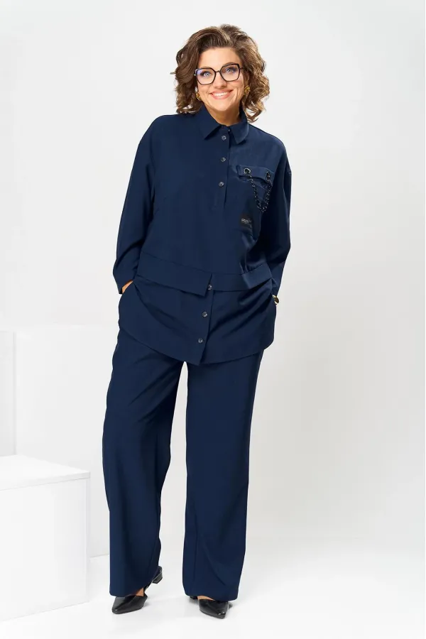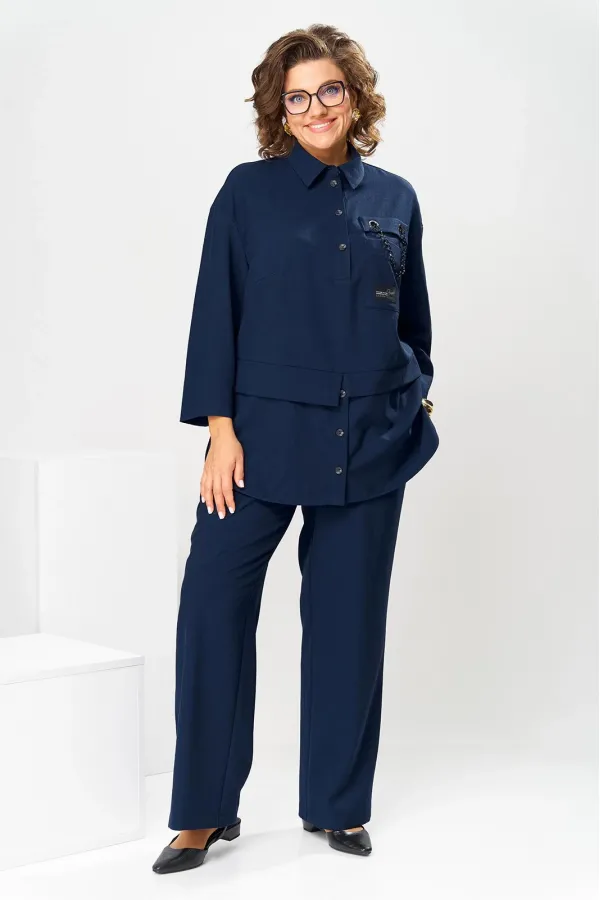 Костюм женский, предназначен для повседневной носки. Костюм женский 2-х предметный блузон и брюки. Блузон женский прямого силуэта, длиной ниже линии бёдер на 9 см. Блузон отрезной по линии талии. Верхняя часть переда с 2-мя нагрудными выточками, с 2-мя втачными планками, с 1-ним накладным прямоугольным карманом с клапаном на левой части переда на уровне линии груди. Карман декорирован аппликациями, клапан декорирован 2-мя пробивными металлическими блочками и декоративной цепочкой. Верхняя часть спинки цельнокроеная. Нижняя часть переда и нижняя часть спинки выполнены из отделочной ткани. Нижняя часть переда с 2-мя цельнокроеными планками с застёжкой на 3-и вертикально обмётанных петли и 2-и пришивные пуговицы. Боковые швы блузона с разрезами, с закруглёнными концами. Низ блузона обтачной. Шов соединения верхней и нижней частей блузона с притачными разноуровневыми планками с обтачными разрезами по центру переда и центру спинки. Горловина круглая с втачным воротником рубашечного типа с отрезной стойкой. Застёжка центральная на планках переда на 4-и обмётанные петли и 4-и пришивных пуговицы. Рукав втачной, одно шовный длиной 7/8. Блузон со спущенным плечом, без плечевых накладок. Брюки женские прямые, длинные. Передние половинки с карманами в боковых швах. Задние половинки с таллиевыми вытачками. Брюки с притачным поясом, собранным на эластичную тесьму. Длина брюк по боковому срезу 101 см. Длина спинки блузон в 78 см, длина рукава 45 см.