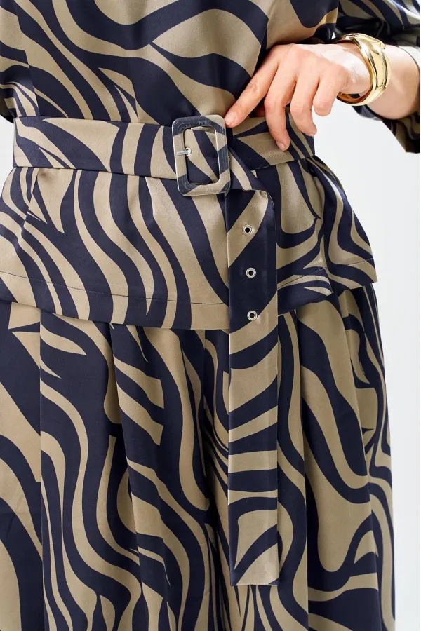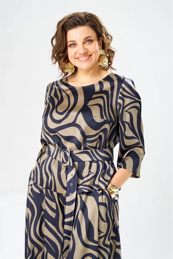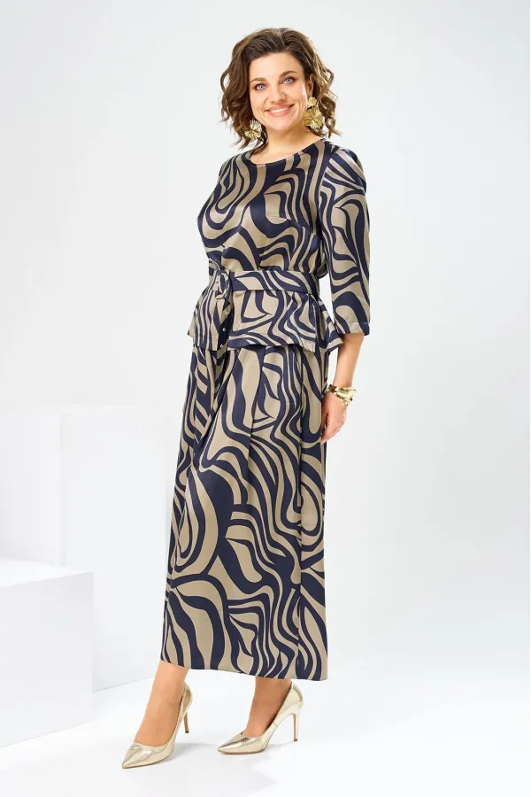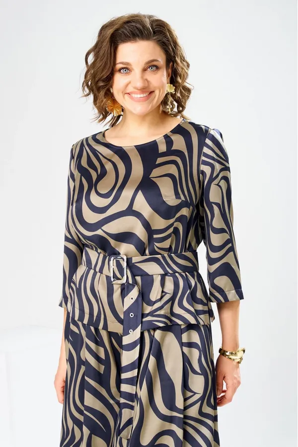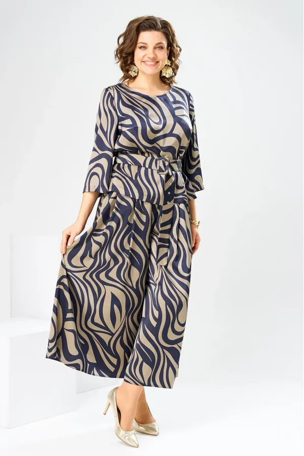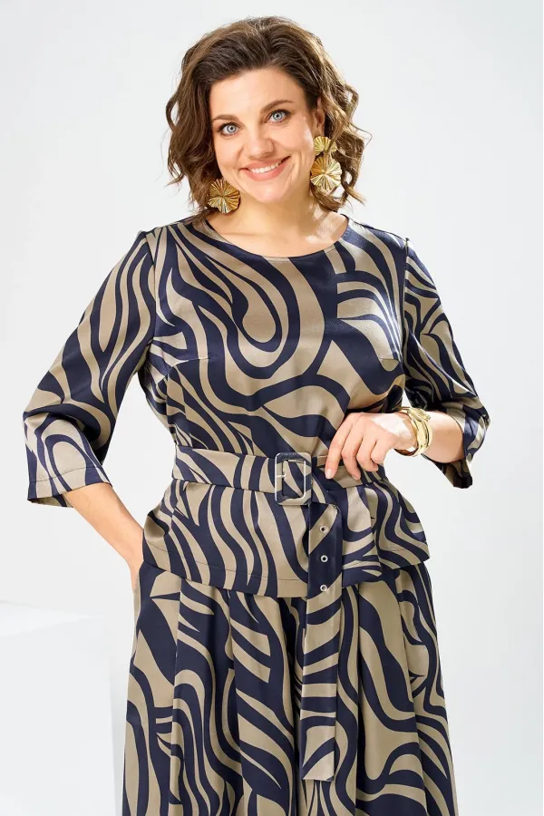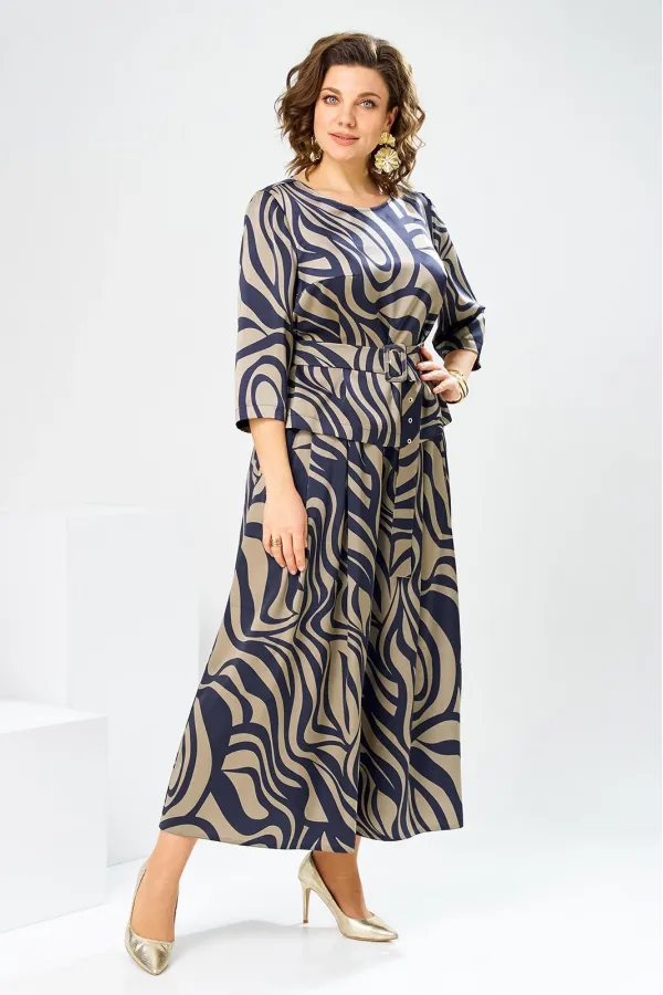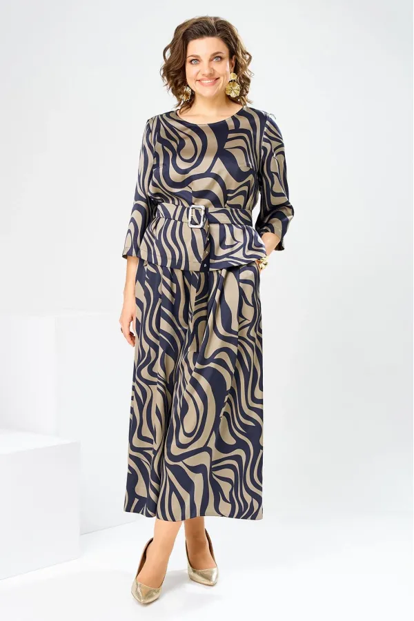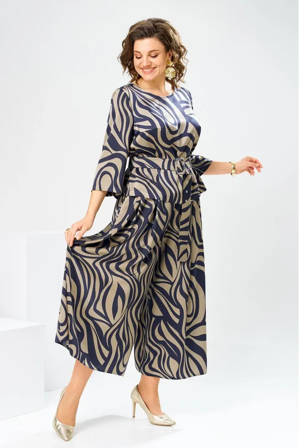Костюм женский предназначен для повседневной носки. Костюм женский 2-х предметный блузка и юбка-брюки. Блузка женская прямого силуэта, длиной до линии бёдер. Перед с 2-мя нагрудными вытачками. Спинка с отрезной кокеткой, с 1-ной встречной складкой, кокетка декорирована пришивной металлической пластиной. Боковые швы с разрезами. Горловина круглая, обточная, без воротника. Рукав втачной одно шовный, 3/4. Блузка без плечевых накладок. Юбка-брюки длинные широкие. Передние половинки с карманами в боковых швах с 2-мя односторонними зафиксированными складками на каждой половинке. Задние без конструктивных особенностей. Пояс притачной, собран на эластичную тесьму, закреплённую 2-мя отделочными строчками. Длина брюк по боковому срезу 90 см. Длина спинки блузона 56 см.