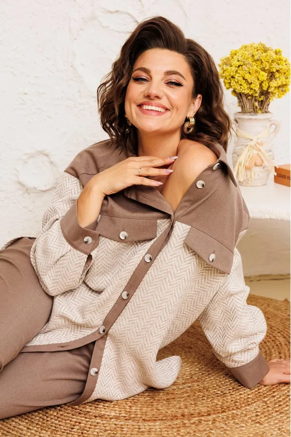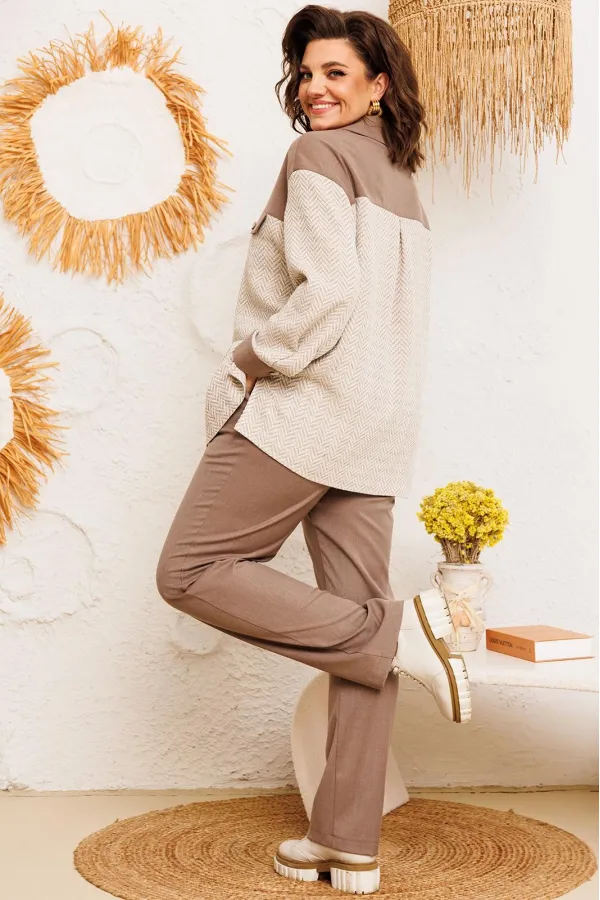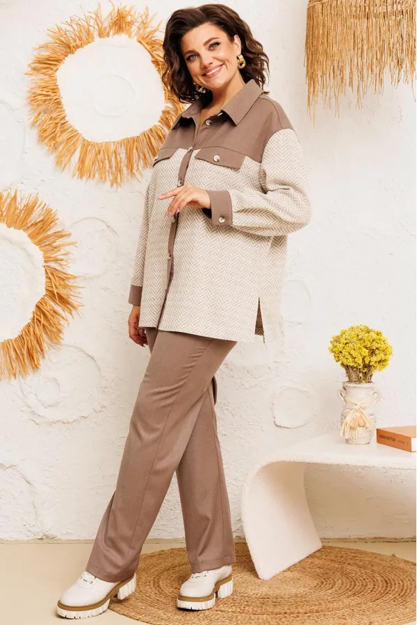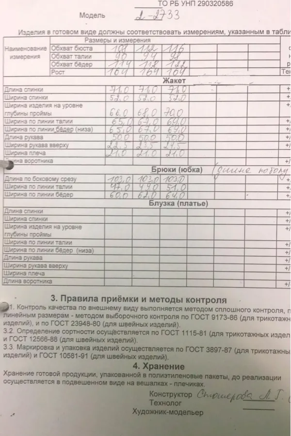Костюм женский предназначен для повседневной носки. Костюм женский 2-х предметный жакет и брюки. Жакет женский прямого силуэта, длиной ниже линии бёдер. Перед с отрезной кокеткой, с 2-мя фигурными клапанами, декорированными пришивными пуговицами, с 2-мя притачными вертикальными планками. Спинка с отрезной кокеткой, с 1-ной центральной встречной складкой. Передняя центральная часть и спинка выполнены из отделочной ткани. Боковые швы с разрезами. Горловина круглая с втачным воротником, рубашечного типа с отрезной стойкой. Застёжка центральная на 7-мь обмётанных петель и 7-мь пришивных пуговиц. Жакет со спущенным плечом. Рукав втачной, 2-х шовный, длинный с притачной манжетой, с застёжкой на 1-ну обмётанную петлю и 1-ну пришивную пуговицу. Рукав из отделочной ткани. Жакет без плечевых накладок. Брюки женские, слегка заужены к низу, длинные. Передние половинки с карманами в боковых швах. Задние половинки с таллиевыми вытачками. Брюки с притачным поясом, собранным на эластичную тесьму, закреплённую 2-мя отделочными строчками. Длина спинки жакета 72 см, длина рукава 51 см, ширина плеча 21 см. Длина брюк по боковому срезу 102 см.