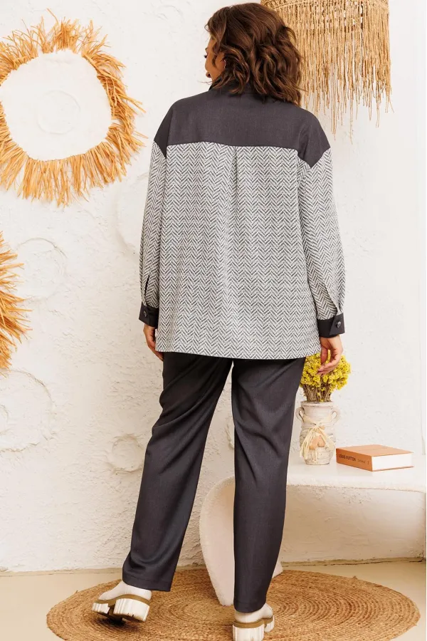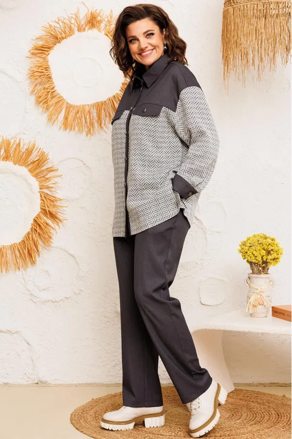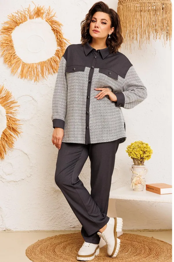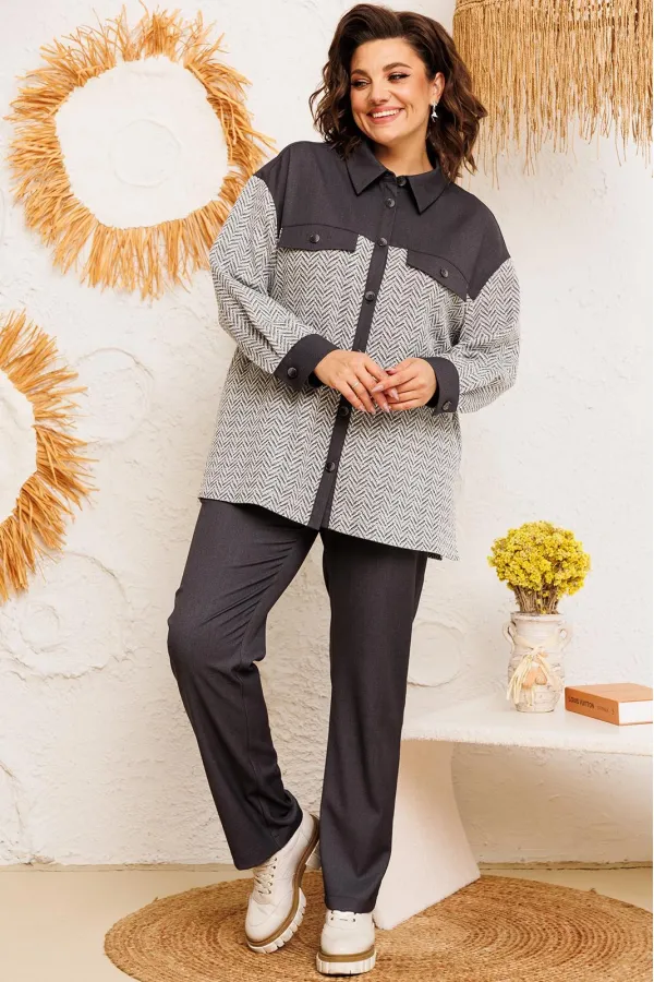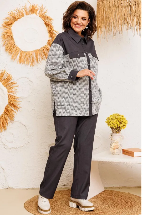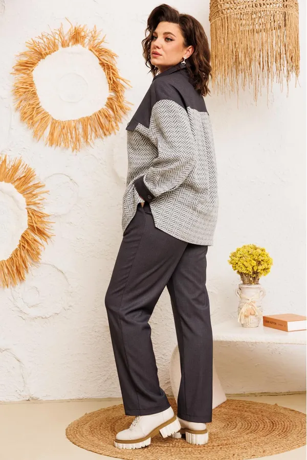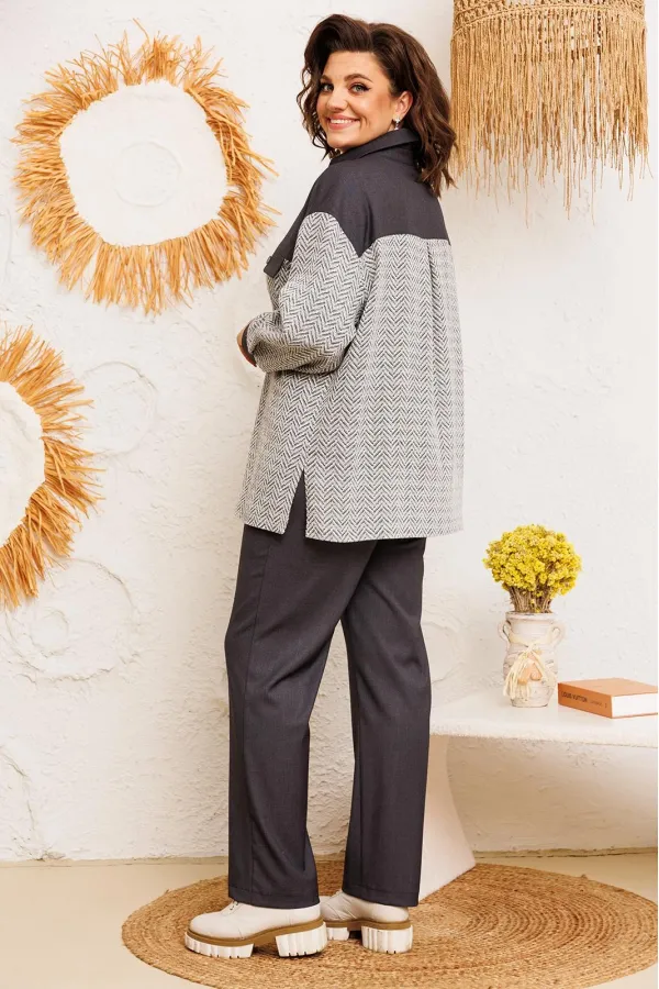 Костюм женский предназначен для повседневной носки. Костюм женский 2-х предметный жакет и брюки. Жакет женский прямого силуэта, длиной ниже линии бёдер. Перед с отрезной кокеткой, с 2-мя фигурными клапанами, декорированными пришивными пуговицами, с 2-мя притачными вертикальными планками. Спинка с отрезной кокеткой, с 1-ной центральной встречной складкой. Передняя центральная часть и спинка выполнены из отделочной ткани. Боковые швы с разрезами. Горловина круглая с втачным воротником, рубашечного типа с отрезной стойкой. Застёжка центральная на 7-мь обмётанных петель и 7-мь пришивных пуговиц. Жакет со спущенным плечом. Рукав втачной, 2-х шовный, длинный с притачной манжетой, с застёжкой на 1-ну обмётанную петлю и 1-ну пришивную пуговицу. Рукав из отделочной ткани. Жакет без плечевых накладок. Брюки женские, слегка заужены к низу, длинные. Передние половинки с карманами в боковых швах. Задние половинки с таллиевыми вытачками. Брюки с притачным поясом, собранным на эластичную тесьму, закреплённую 2-мя отделочными строчками. Длина спинки жакета 72 см, длина рукава 51 см, ширина плеча 21 см. Длина брюк по боковому срезу 102 см.