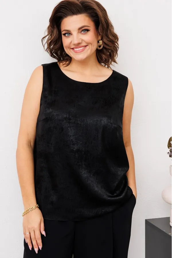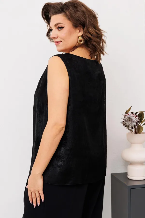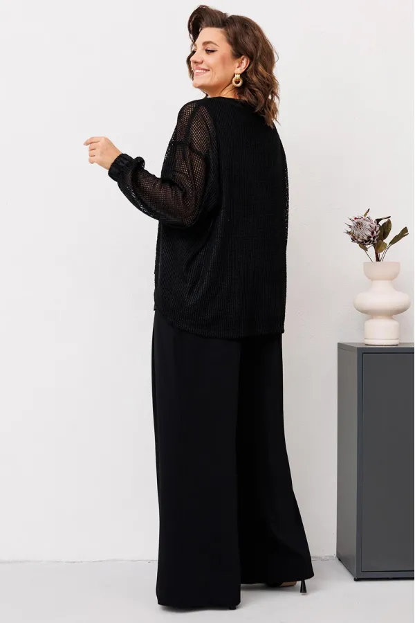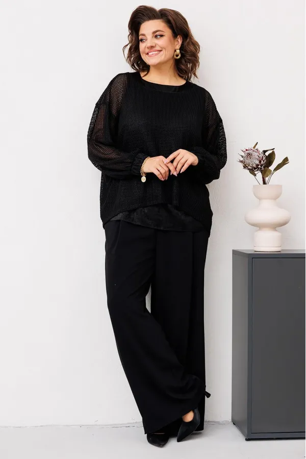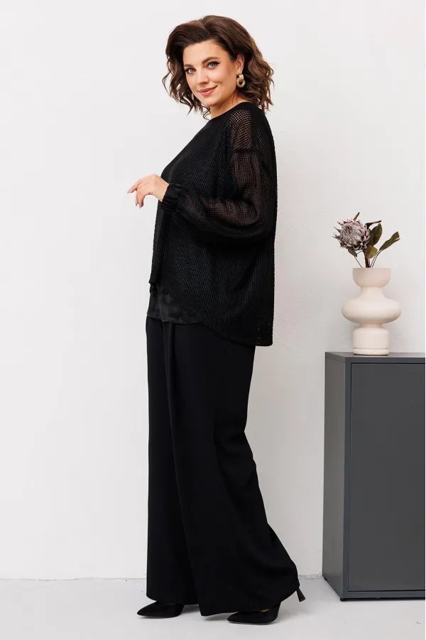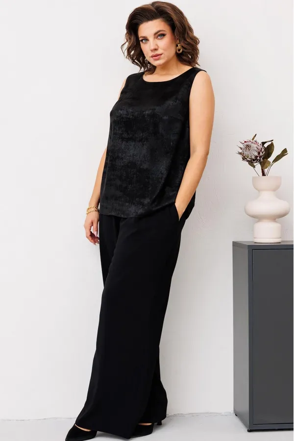 Комплект женский относится к торжественной одежде. Комплект женский 3-х предметный джемпер, топ и брюки. Джемпер прямого силуэта, с фигурным низом. Перед и спинка цельнокроеные, с притачной планкой из отделочной ткани по горловине. Джемпер со спущенным плечом. Рукав втачной, одно шовный, длинный, с притачной манжетой, собранной на эластичную тесьму. Джемпер без плечевых накладок. Топ женский прямого силуэта, длиной до линии бёдер. Перед с 2-мя нагрудными вытачками. Спинка цельнокроеная. Горловина круглая, без воротника. Проймы обтачные. Топ на подкладке. Брюки женские прямые широкие, длинные. Передние половинки с односторонними складками и карманами в боковых швах. Задние половинки с таллиевыми вытачками. Брюки с притачным поясом, собранным на эластичную тесьму, закреплённую 2-мя отделочными строчками.