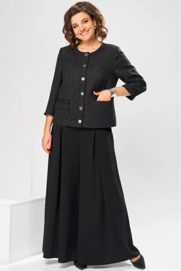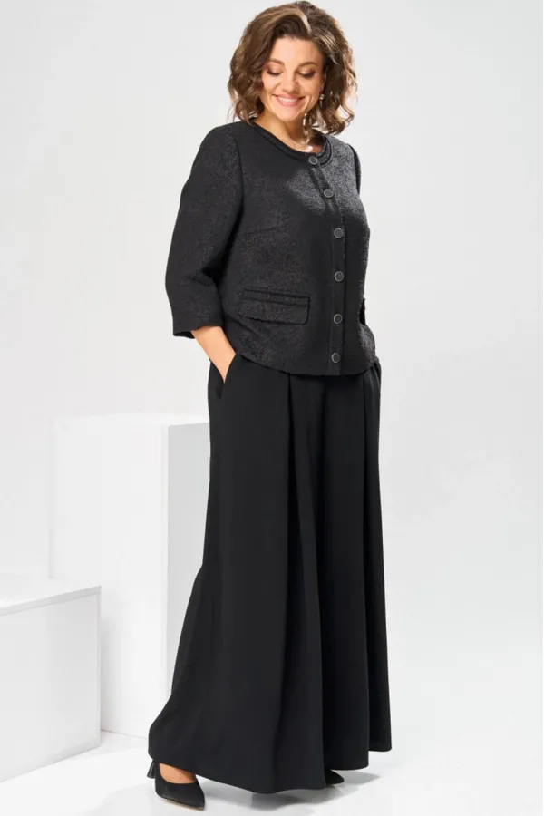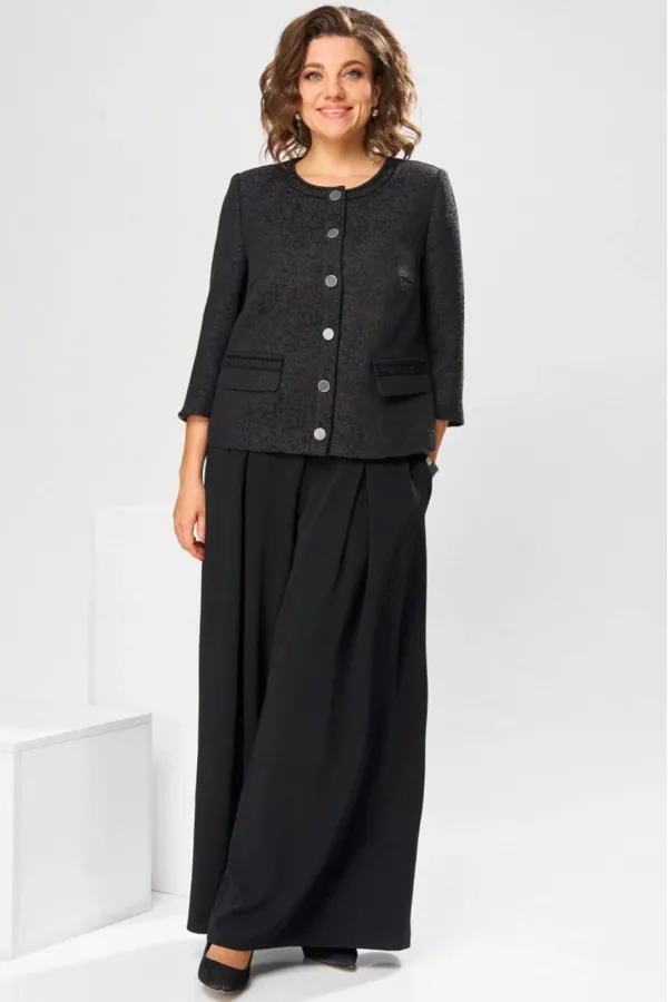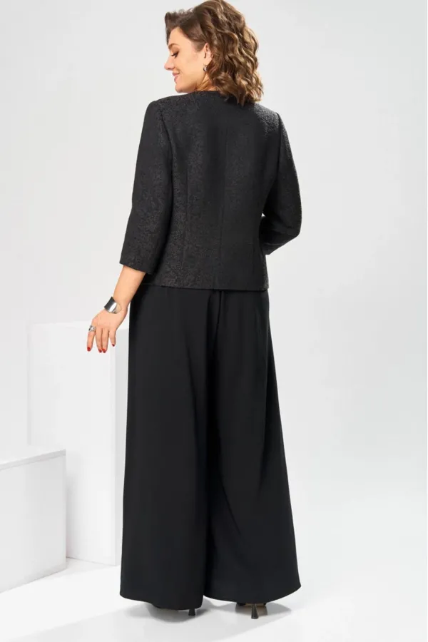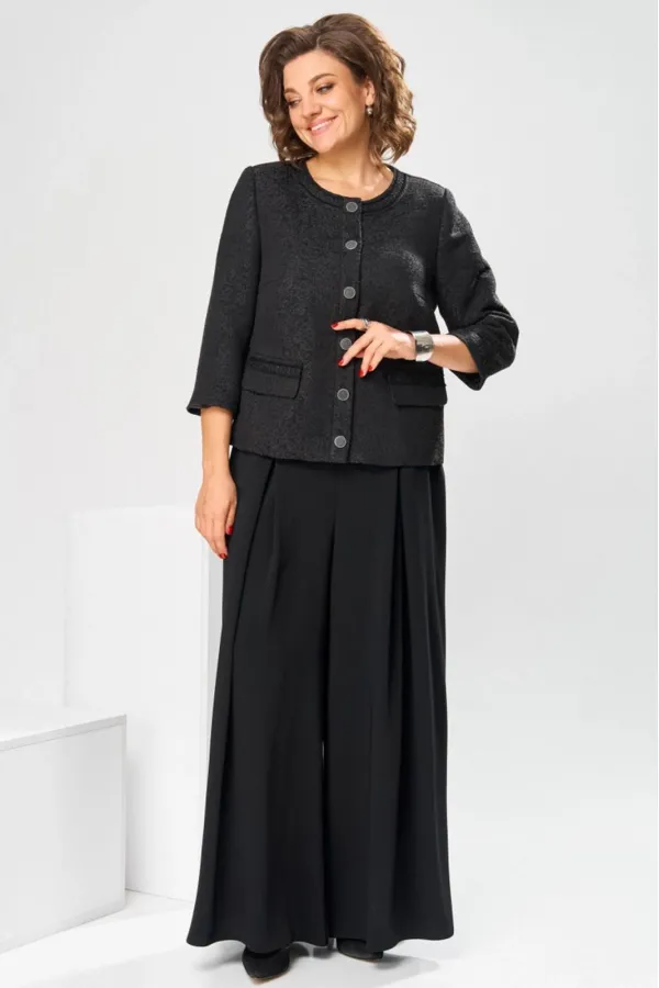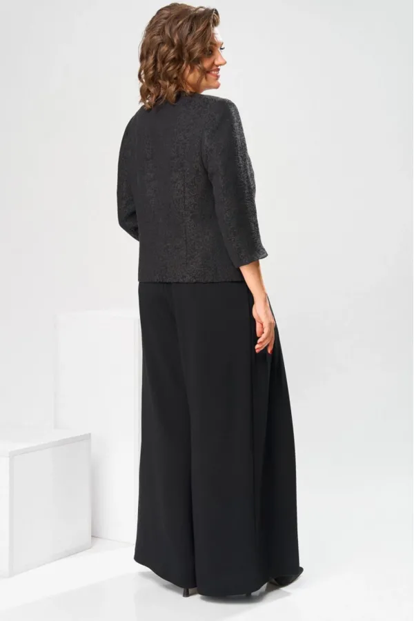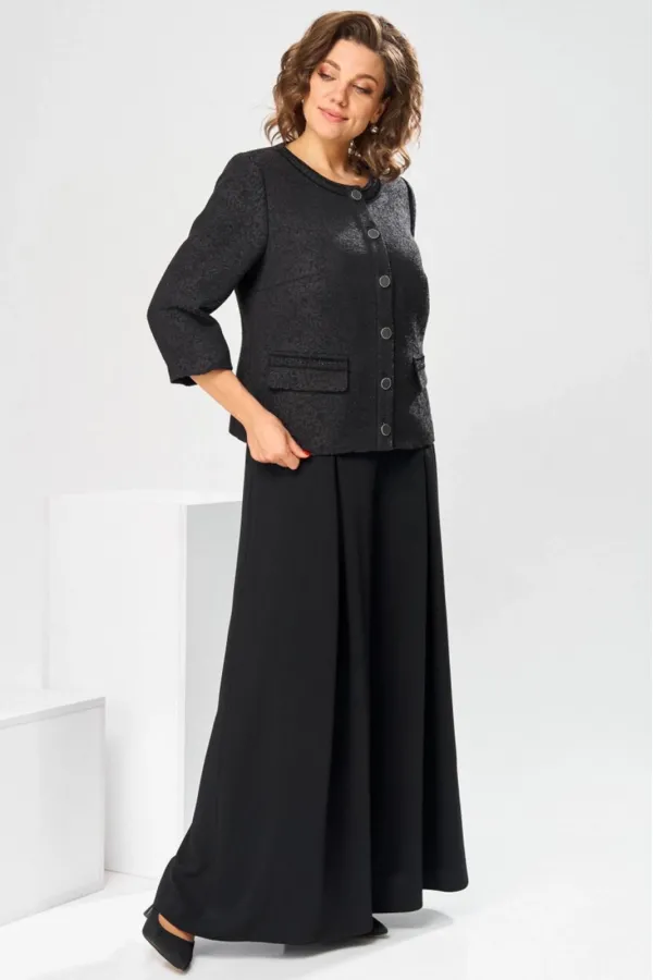 Костюм женский относится к нарядной торжественной одежде. Костюм женский 2-х предметный жакет и брюки. Жакет женский полуприлегающего силуэта, длиной до линии бёдер. Перед с 2-мя нагрудными вытачками с притачными планками по горловине, декорированными надстрочной отделочной тесьмой, с 2-мя надстрочными вертикальными планками, с 2-мя прорезными карманами с клапаном с закруглёнными концами и листочкой, клапан декорирован надстрочной отделочной тесьмой, карманы расположены ниже линии талии на 2 см. Спинка с 2-мя таллиевыми вытачками и средним швом. Горловина круглая, обточная, без воротника. Застёжка центральная бортовая на 6-ть вертикально обмётанных петель и 6-ть пришивных пуговиц. Рукав 2-х шовный втачной, длиной 3/4. Жакет на притачной подкладке. Брюки женские, широкие, длинные. Передние половинки со встречными складками с карманами в боковых швах. Задние половинки без конструктивных особенностей. Брюки с притачным поясом, собранным на эластичную тесьму, закреплённую 2-мя отделочными строчками. Длина спинки жакета 58 см, длина рукава 48 см. Длина брюк по боковому срезу 99 см.