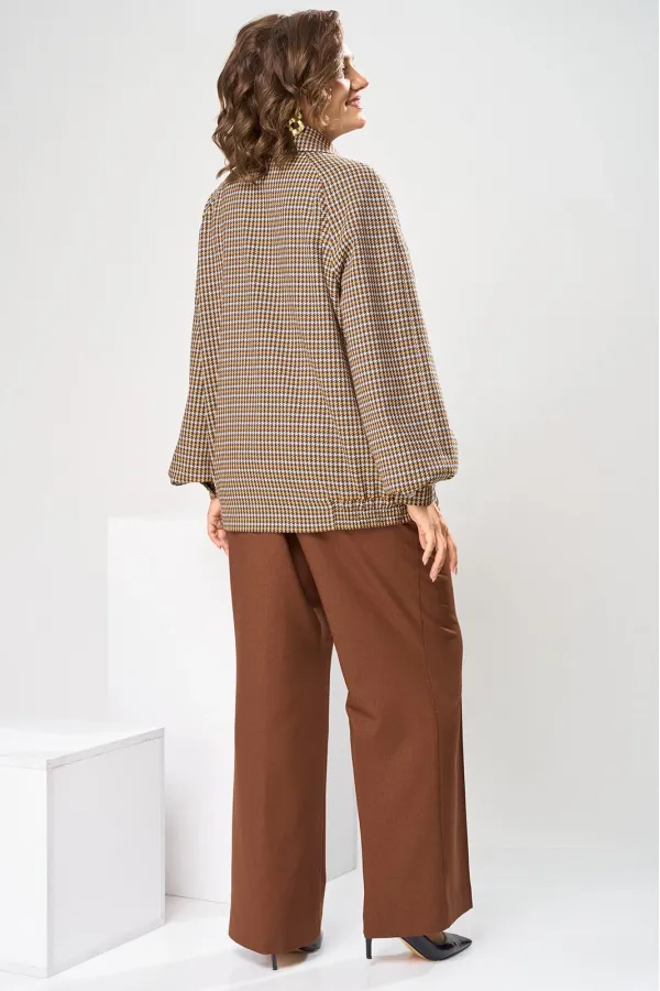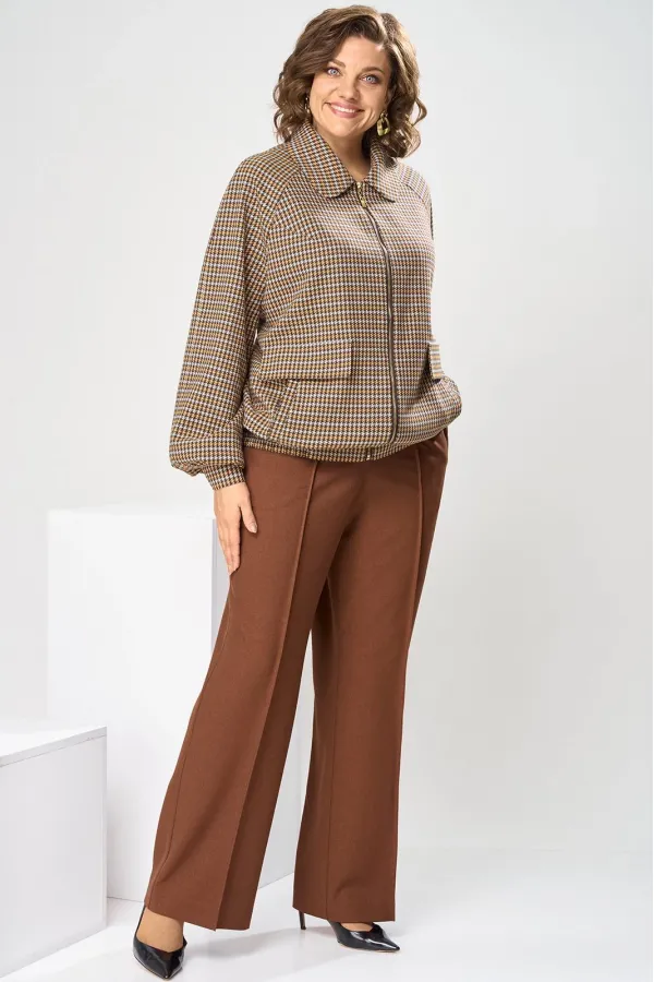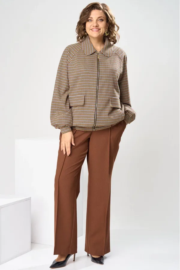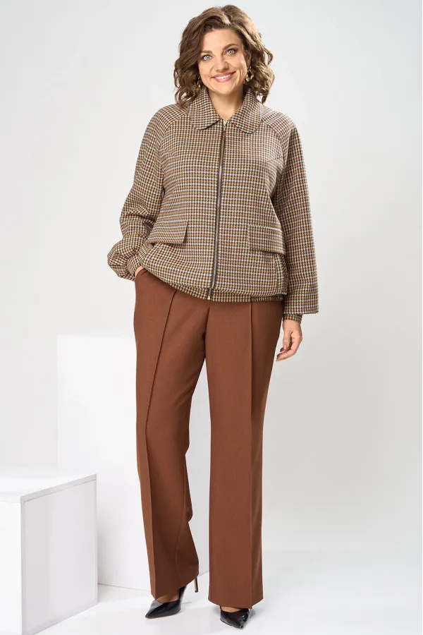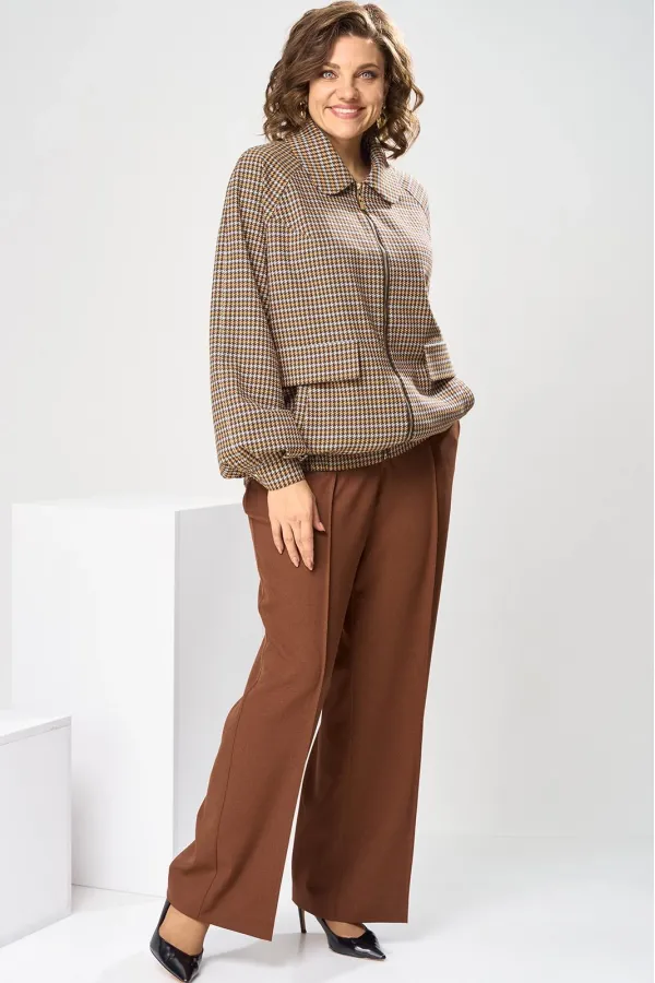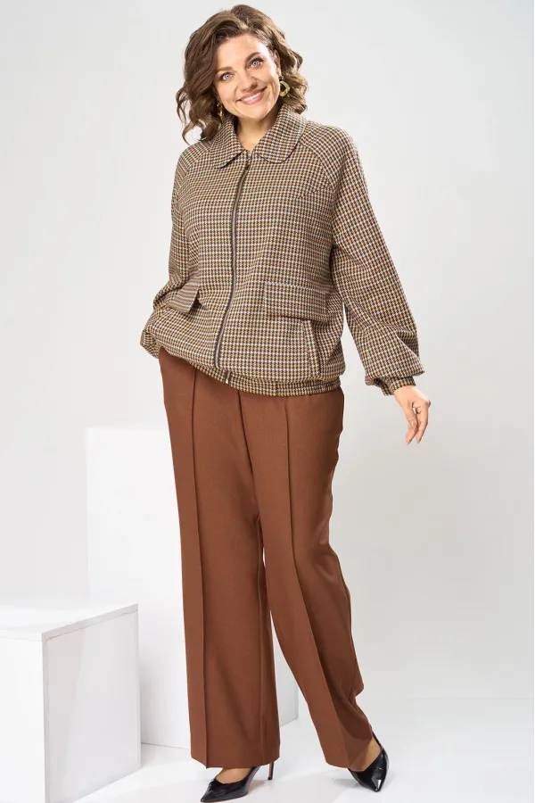 Костюм женский, предназначен для повседневной носки. Костюм женский 2-х предметный. Жакет и брюки. Жакет женский прямого силуэта, длиной до линии бёдер. Перед с 2-мя нагрудными вытачками, выходящими из пройм, с 2-мя прорезными карманами с листочками расположенными на уровне линии бёдер с 2-мя построчными клапанами, расположенными над карманами. Спинка цельнокроеная. Низ частично (по бокам) с втачным поясом собранным на эластичную тесьму, закреплённую 2-мя отделочными строчками. Горловина с втачным воротником с закруглёнными концами с отрезной стойкой. Застёжка центральная бортовая на разъёмную тесьму-молнию. Рукав втачной реглан, 2-х шовный, длинный с 4-мя односторонними складками по низу и притачной манжетой, с застёжкой на 1-ну обмётанную петлю и 1-ну пришивную пуговицу. Жакет без плечевых накладок. Жакет на притачной подкладке. Брюки женские прямые длинные.