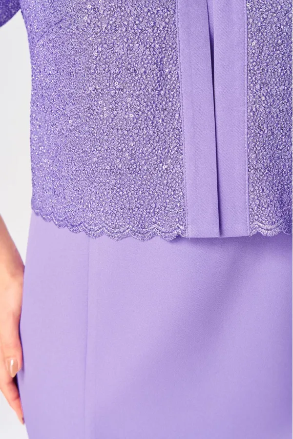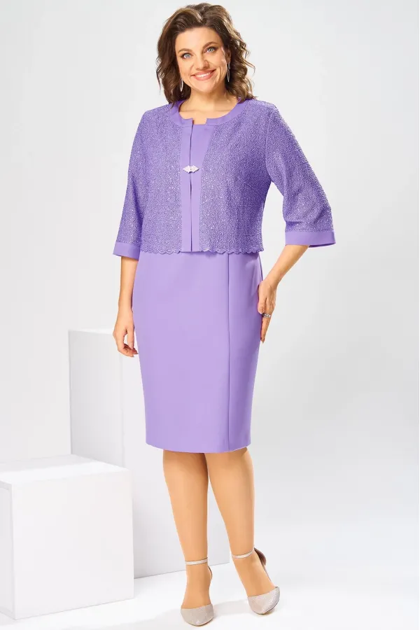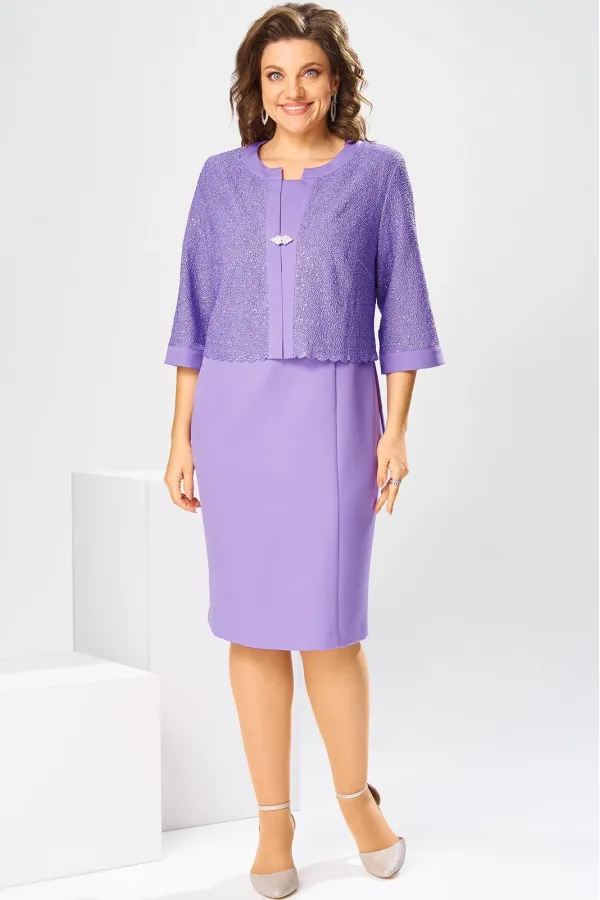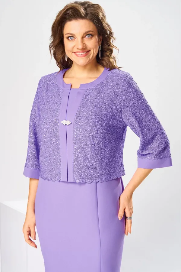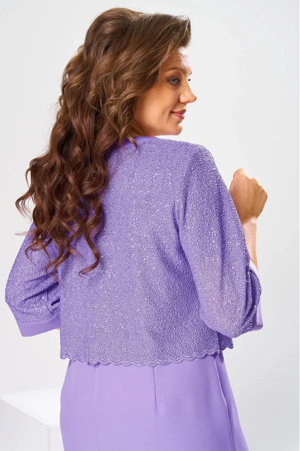 Комплект женский, относится к торжественно-нарядной одежде. Комплект женский, 2-х предметный, жакет и платье. Жакет женский прямого силуэта, длиной до линии талии, выполнен из кружевного полотна. Перед с 2-мя нагрудными вытачками, с 2-мя притачными вертикальными планками, с притачными планками по горловине. Спинка с притачной планкой по горловине. Горловина круглая, обточная, без воротника. Застёжка на декоративный пришивной крючок. Рукав втачной одно шовный, длиной 3/4 с притачной манжетой. Жакет без плечевых накладок. Платье женской длиной за колено, полу прилегающего силуэта. Перед с 2-мя отрезными бочками. Спинка с 2-мя таллиевыми вытачками, со средним швом, заканчивающимся шлицей. Горловина круглая, обточная, без воротника. Застёжка на потайную тесьму-молнию в среднем шве спинки. Рукав втачной, короткий, одно шовный. Платье с плечевыми накладками. Длина спинки жакета 45 см, длина рукава 41 см. Длина спинки платья 100 см, длина рукава 19 см.