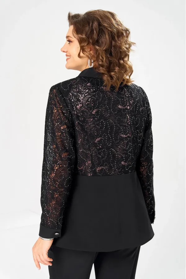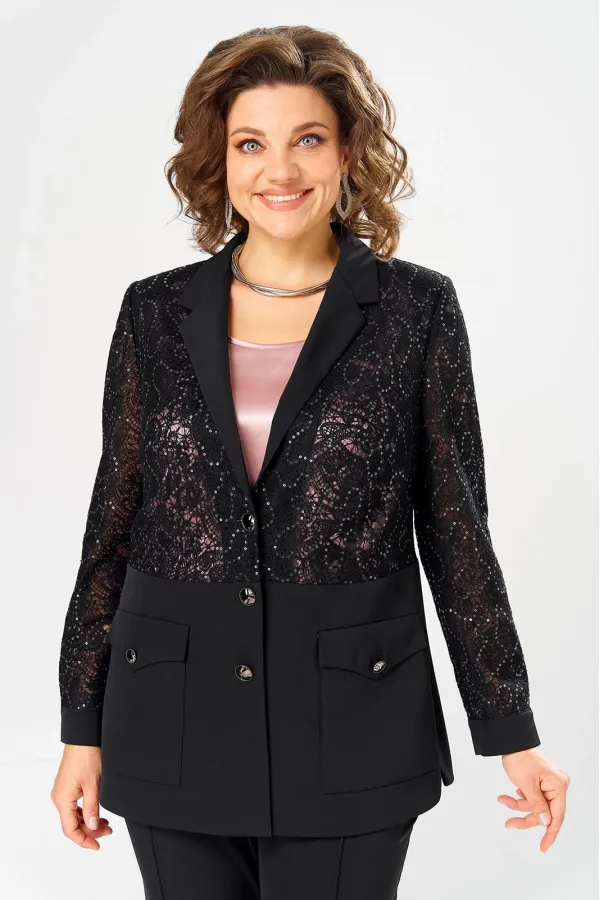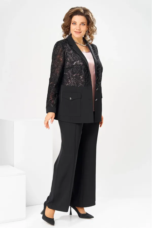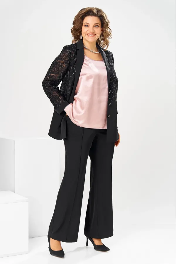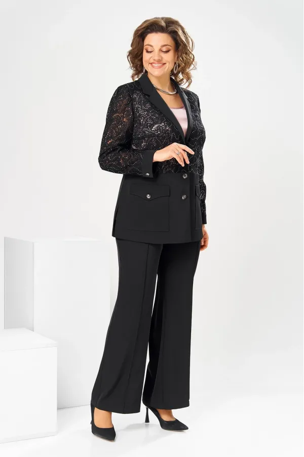 Комплект женский, относится к торжественной нарядной одежде. Комплект женский, 3-х предметный, жакет, топ и брюки. Жакет полу прилегающего силуэта, длиной ниже линии бёдер н6а 9 см. Жакет отрезной по линии талии. Верхняя часть переда из отделочной ткани с 2-мя нагрудными вытачками, нижняя двойная с накладными фигурными карманами с фигурными клапанами, с застёжкой на обмётанную петлю и пришивную пуговицу. Верхняя часть спинки из отделочной ткани, с 2-мя таллиевыми вытачками, нижняя двойная, обтачная. Горловина с v-образным вырезом с втачным воротником пиджачного типа с отложным лацканом. Застёжка центральная ботовая на 3-и обмётанные петли и пришивные пуговицы. Рукав из отделочной ткани, длинный, 2-х шовный, втачной с притачной манжетой с застёжкой на 1-ну обмётанную петлю и 1-ну пришивную пуговицу. Жакет с плечевыми накладками. Топ женский прямого силуэта, длиной до линии бёдер. Перед с 2-мя нагрудными вытачками. Спинка без конструктивных особенностей, цельнокроеная. Боковые швы с разрезами. Горловина круглая, без воротника. Горловина проймы обработаны косой бейкой. Брюки женские прямые, длинные. Передние половинки с карманами в боковых швах , по центру с декоративными защипами шириной 0,2 см. Задние половинки с таллиевыми вытачками. Застёжка центральная на тесьму-молнию. Брюки с притачным поясом с застёжкой на 1-ну обмётанную петлю и 1-ну пришивную пуговицу, по бокам собранным на эластичную тесьму, закреплённую 2-мя отделочными строчками. Длина спинки жакета 71 см. Длина брюк по боковому шву 103 см, длина брюк по шаговому шву 76 см. Длина спинки топа 64 см.