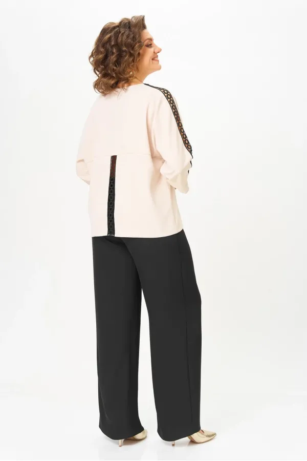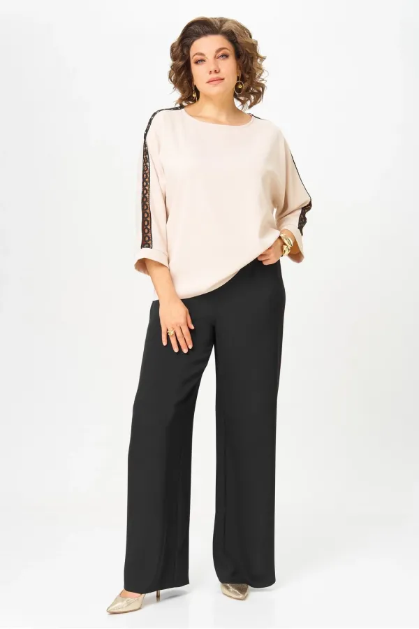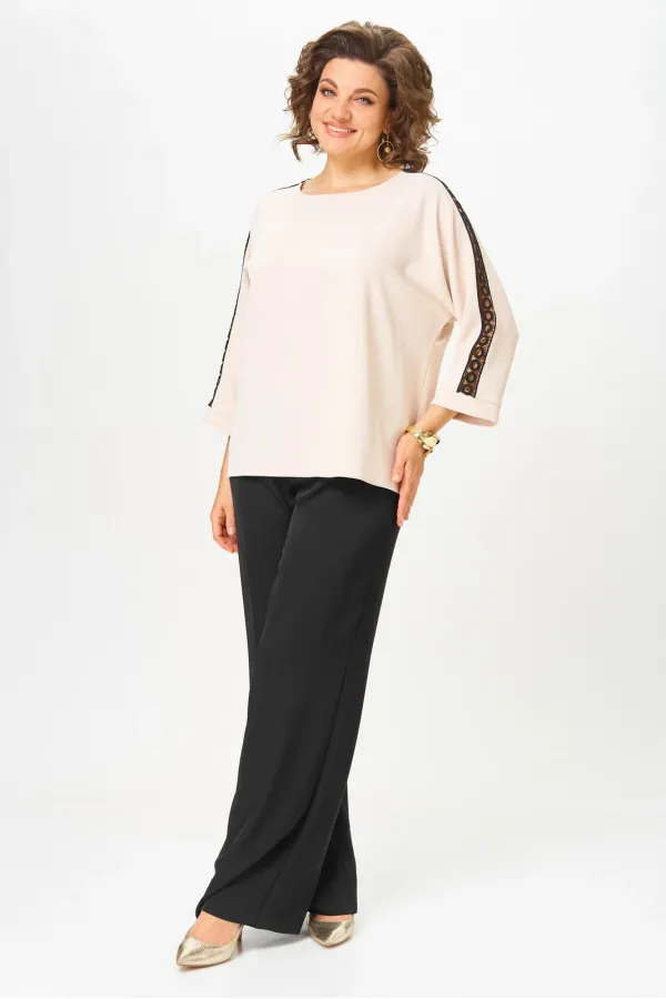 Элегантный женский костюм из легкой, струящейся ткани. Блузка женская из текстильной ткани с цельнокроеным рукавом. Прямого силуэта. По спинке расположен подрез. В шов вставлено кружево. Рукав 3/4, низ рукава с манжетой.... Читать далее...