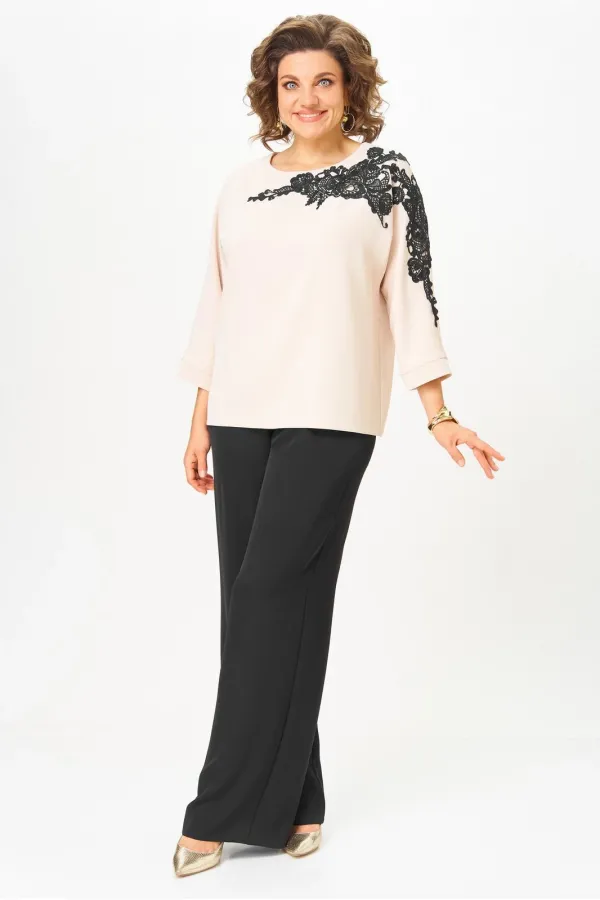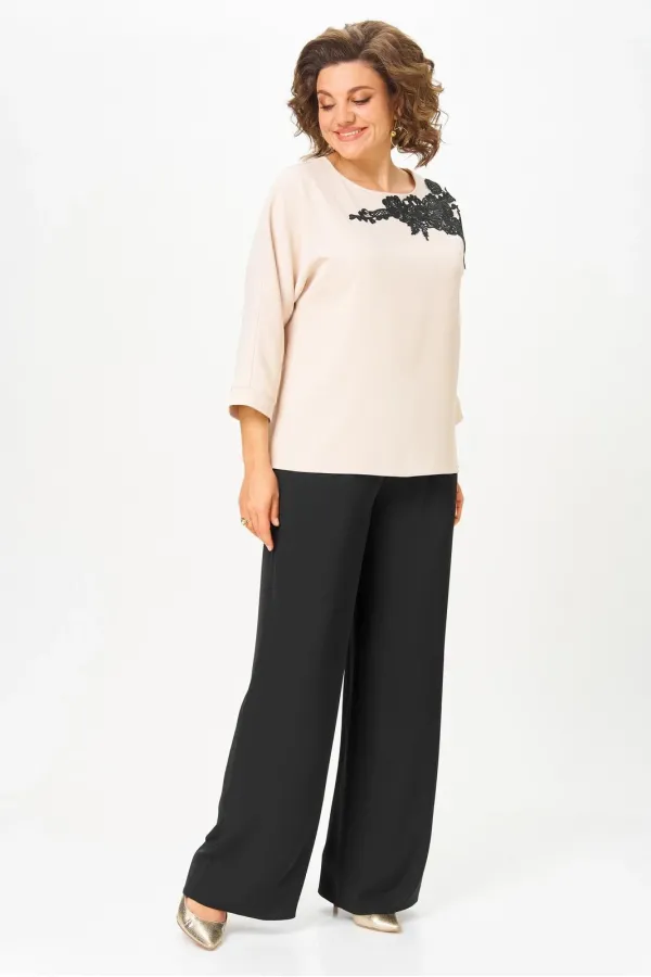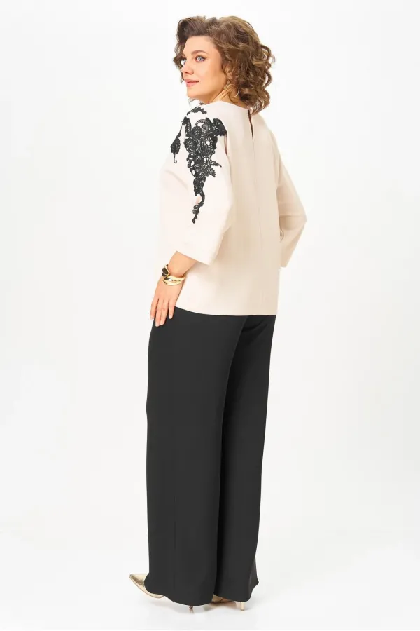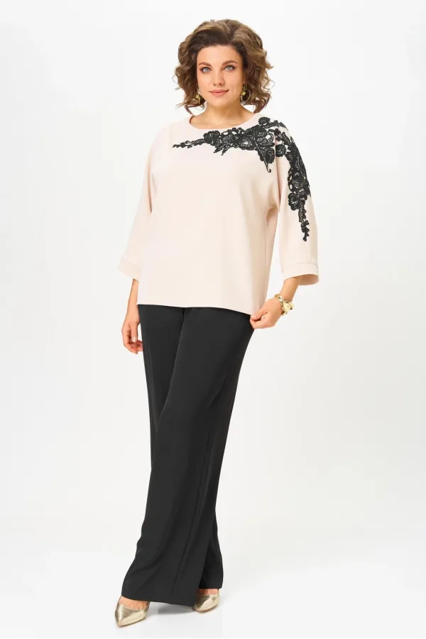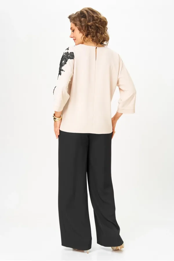 Блузка женская из текстильной ткани с цельнокроеным рукавом. Прямого силуэта. По переду блузки настрочена аппликация. По спинке расположен средний шов. Рукав 3/4, низ рукава с манжетой. Вырез горловины круглый, обработан обтачкой. Блузка застегивается на петлю-пуговицу.