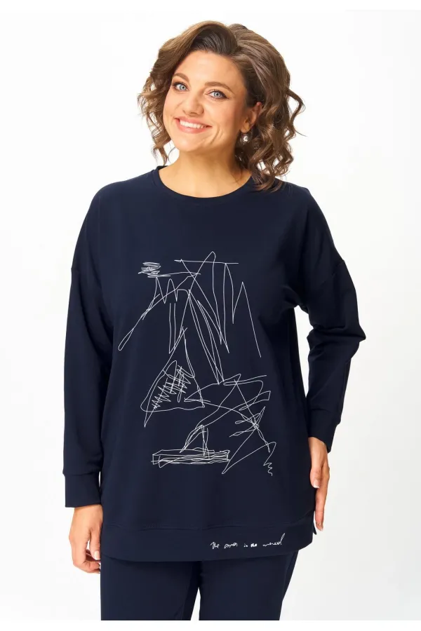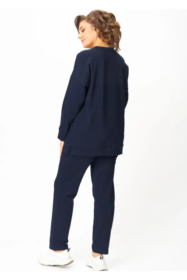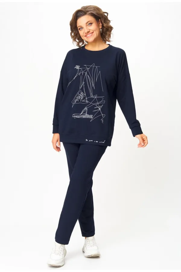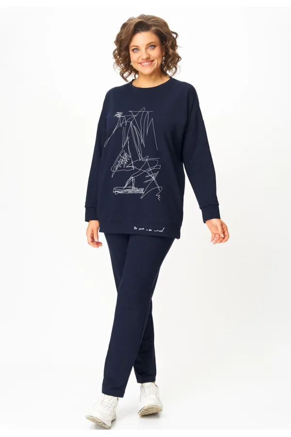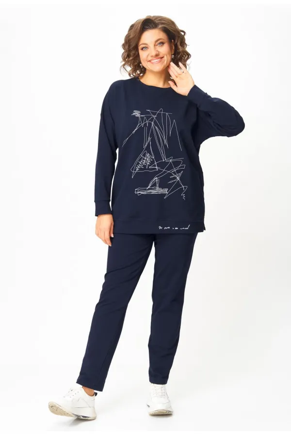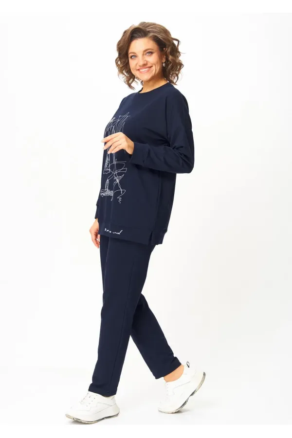 Комплект женский, двухпредметный, состоящий из свитшота и брюк. Свитшот с длинным спущенным рукавом, по полочке и по низу планки-печать. Круглая горловина, рукав на манжете.Брюки зауженные к низу, в боковых швах карманы, пояс на резинке.