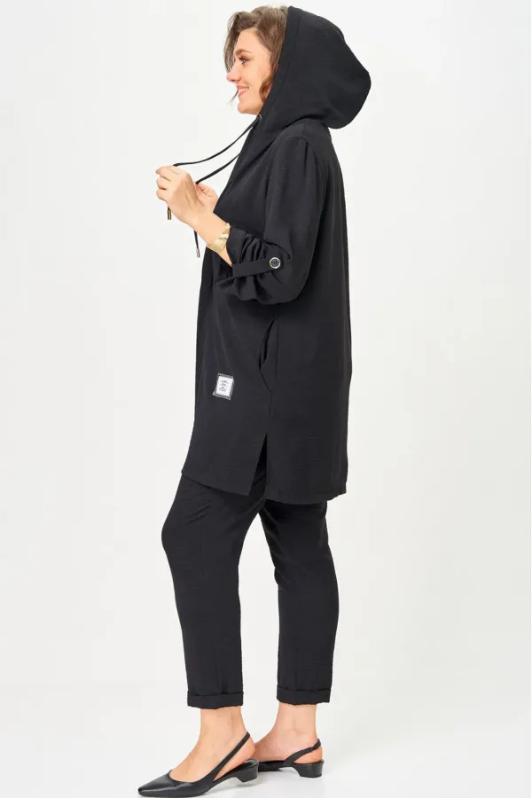 Кардиган прямого силуэта с втачным рукавом. По горловине капюшон со шнурком. Рукава кардигана фиксируются на верх патой. Сборка по рукаву зафиксирована. В боковых швах обработаны карманы и разрезы.