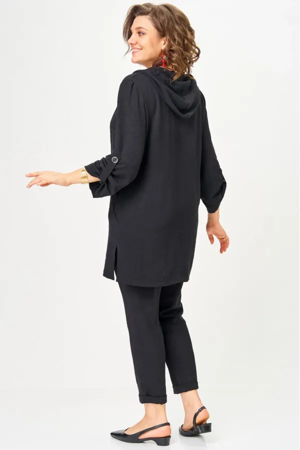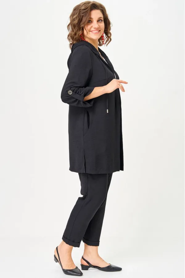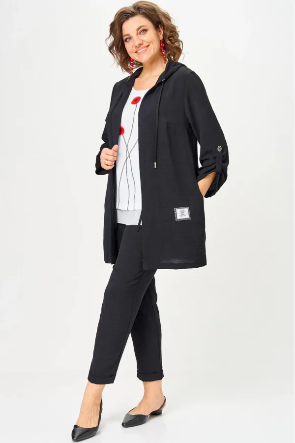 Костюм женский трехпредметный, состоящий из кардигана, топа и брюк.Кардиган прямого силуэта с втачным рукавом. По горловине капюшон со шнурком. Рукава кардигана фиксируются на верх патой. Сборка по рукаву зафиксирована. ... Читать далее...