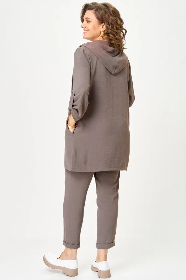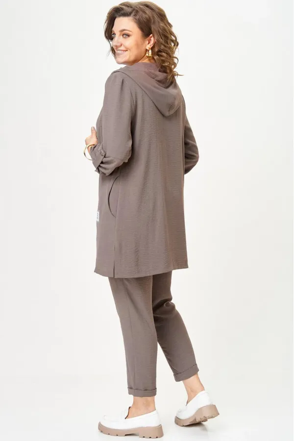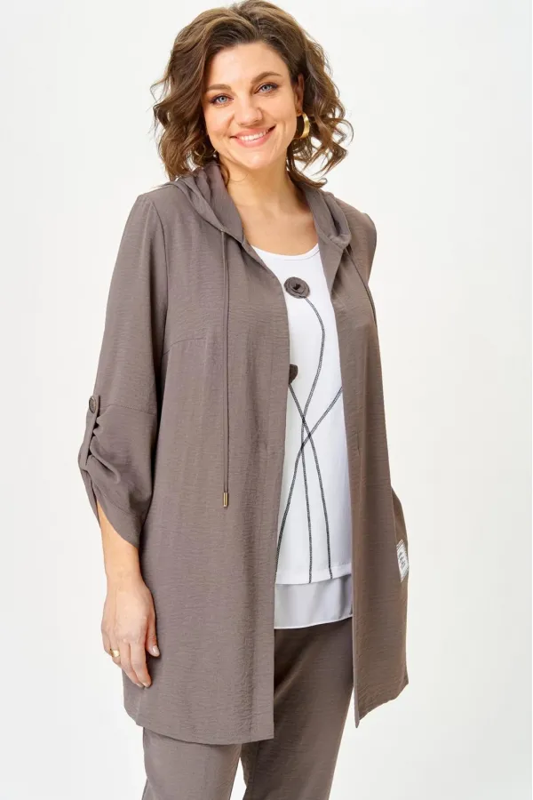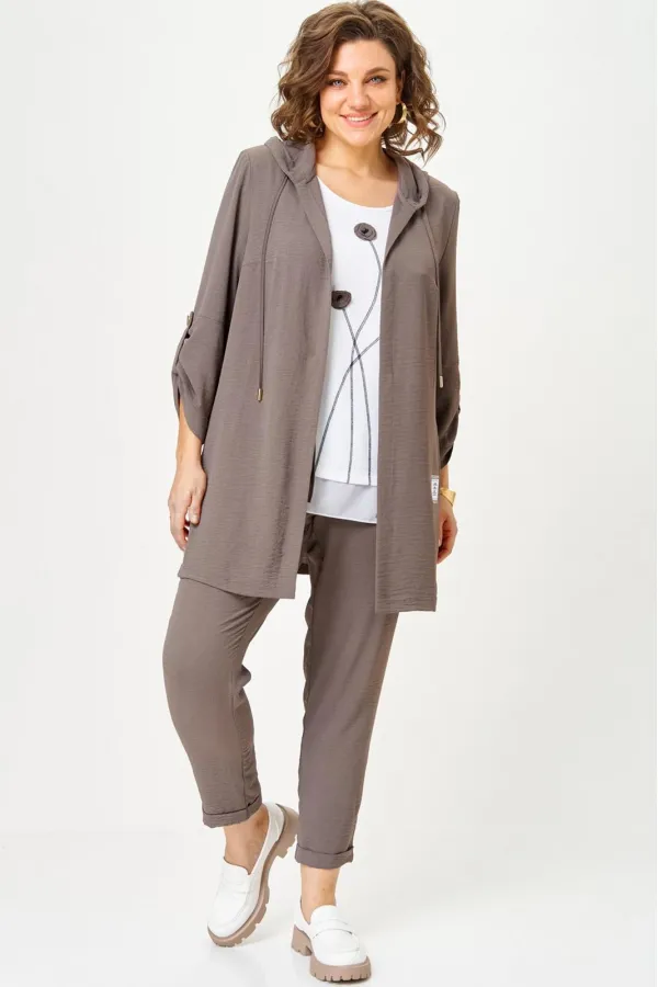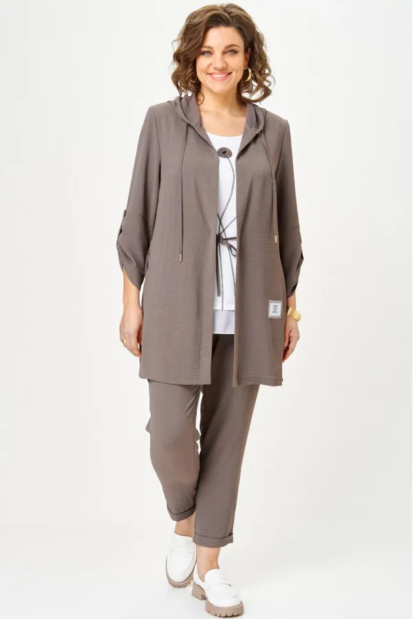 Костюм женский трехпредметный, состоящий из кардигана, топа и брюк.Кардиган прямого силуэта с втачным рукавом. По горловине капюшон со шнурком. Рукава кардигана фиксируются на верх патой. Сборка по рукаву зафиксирована. ... Читать далее...
