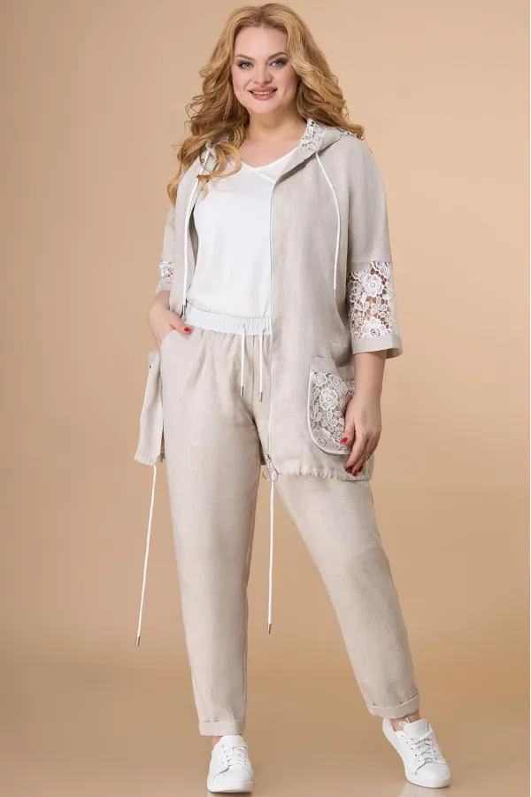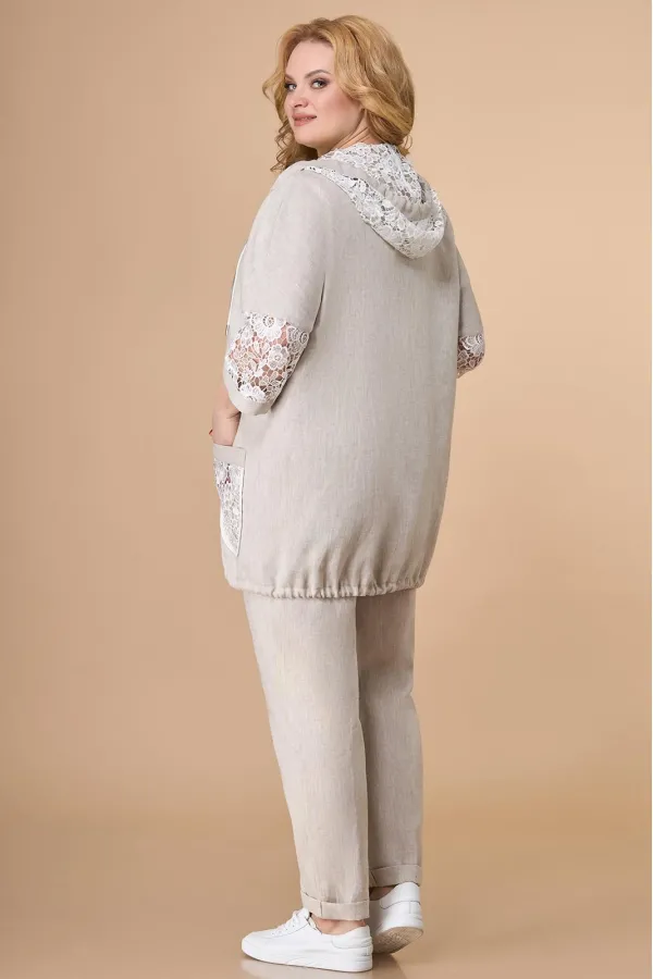 Костюм женский двухпредметный, состоящий из жакета и брюк.Жакет прямого силуэта. Застежка на молнию. По горловине капюшон на кулисе. По полочкам накладные карманы. Карманы, вставка рукава и капюшон выполнены из гипюра. Н... Читать далее...