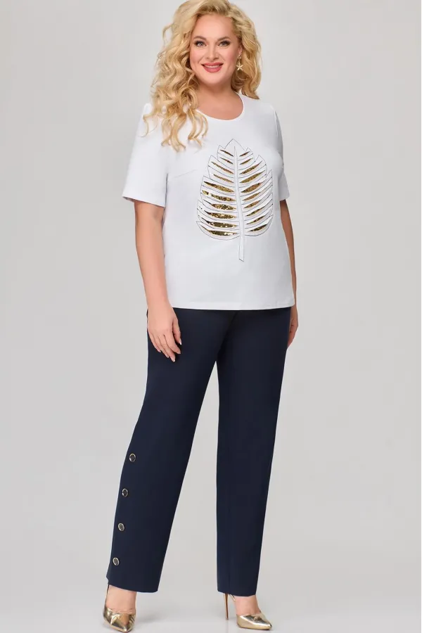 Брюки прямого силуэта, на притачном поясе. В боковых швах наклонные карманы. На задних половинках таливые вытачки. Застежка – гульфик на молнию спереди. Пояс застегивается на пуговицу. По низу брюк в боковых швах шлица с застежкой на петли и пуговицы.