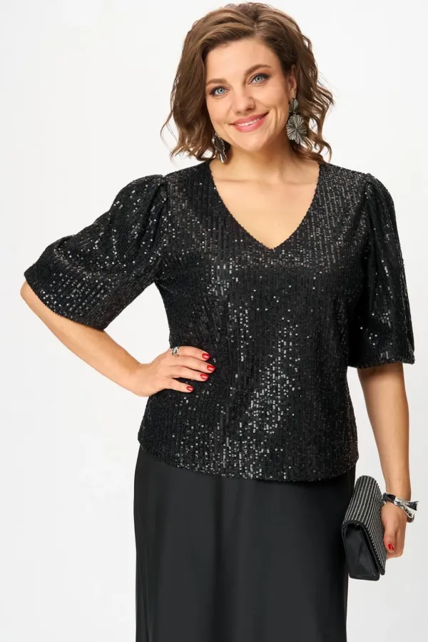 Блузка из ткани в пайетки прямого силуэта с втачным рукавом, на трикотажной подкладке. Вырез горловины v-образный формы. Рукава длиной ¾ объемные к низу, добавляют романтичности и легкости. По окату рукава складки, по низу рукава резинка.