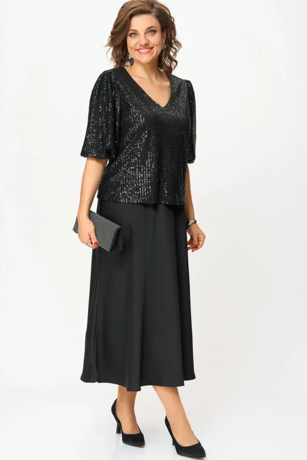 Костюм женский двухпредметный состоящий из блузки и юбки.Блузка из ткани в пайетки прямого силуэта с втачным рукавом, на трикотажной подкладке. Вырез горловины v-образный формы. Рукава длиной ¾ объемные к низу, добавляют... Читать далее...