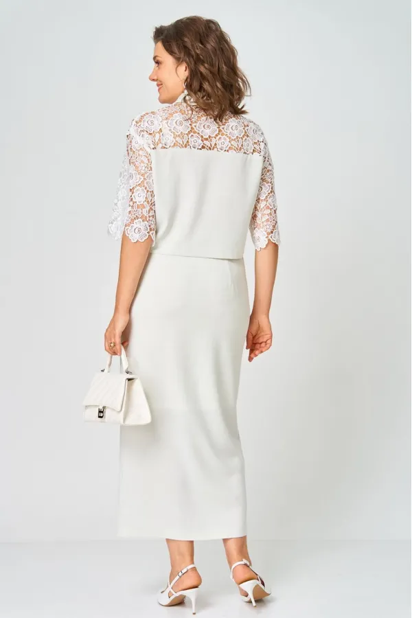 Жакет длиной до линии бедер прямого силуэта с втачным рукавом. Линия плеча спущена. Застежка центральная на петли и пуговицы, по горловине отложной воротник. По переду накладные карманы. Кокетка из кружева по переду и спинке добавляет романтичности и легкости.