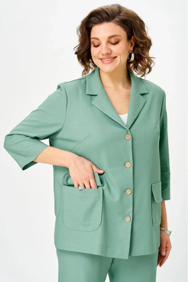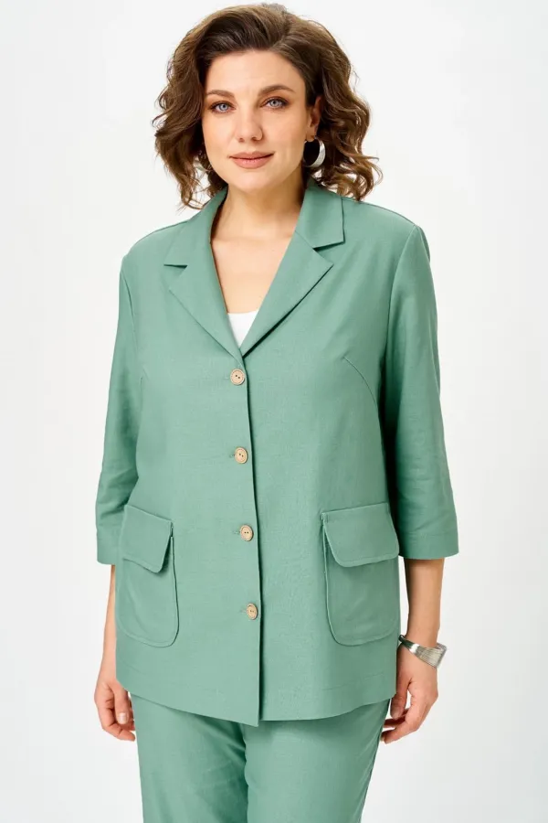 Жакет прямого силуэта с втачным укороченным рукавом. Воротник отложной с лацканами. Застежка центральная на петли и пуговицы. В нижней части переда накладные карманы с клапаном. По спинке кокетка.