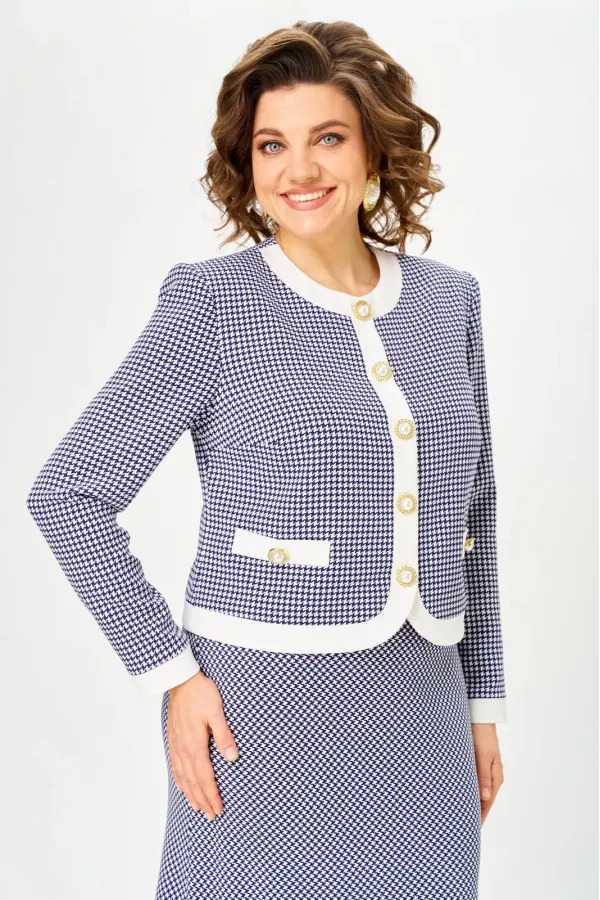 Жакет в стиле «Шанель» полуприлегающего силуэта с втачным рукавом, на трикотажной подкладке. Горловина округлой формы. Застежка центральная на пять обметанных петель и пять акцентных пуговиц. Перед с вытачками по линии груди, в нижней части декоративные карманы. По горловине, краю борта, низу жакета и рукавов отрезная планка.