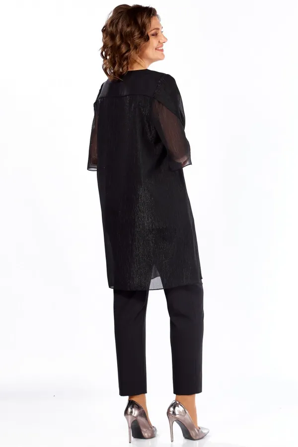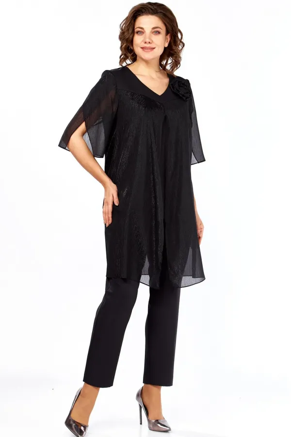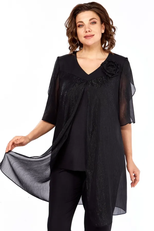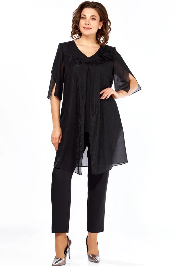 Нарядный костюм двойка, состоит из блузы и брюк. Блуза выполнена с отлетным шифоном по спинке, рукав также из шифона. Длина шифона 92 см. Длина рукава 39 см. Глубина выреза на груди 15 см. Брюки классического кроя, на ре... Читать далее...