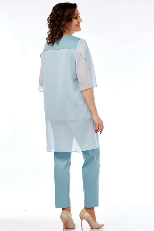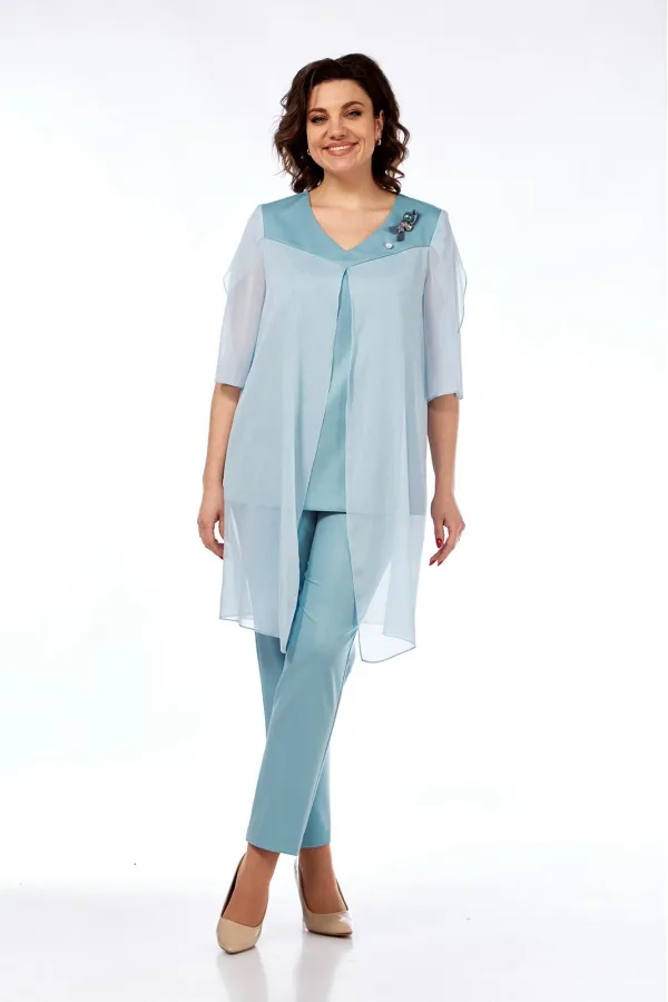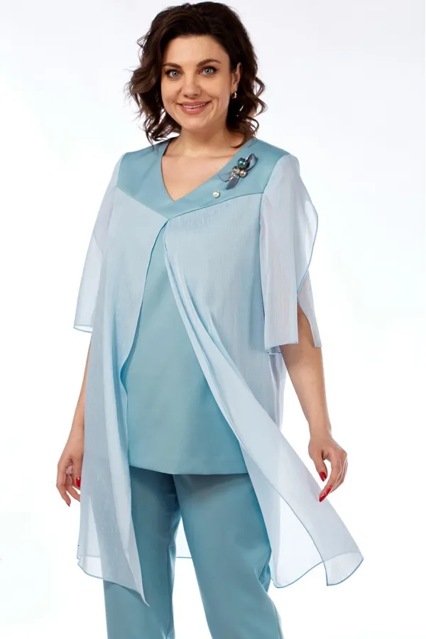 Нарядный костюм двойка, состоит из блузы и брюк. Блуза выполнена с отлетным шифоном по спинке, рукав также из шифона. Длина шифона 92 см. Длина рукава 39 см. Глубина выреза на груди 15 см.
