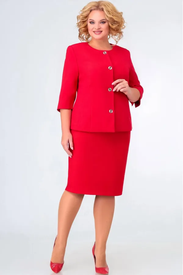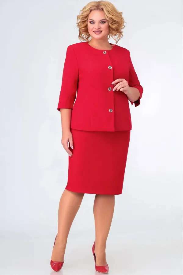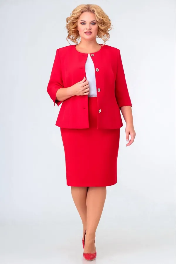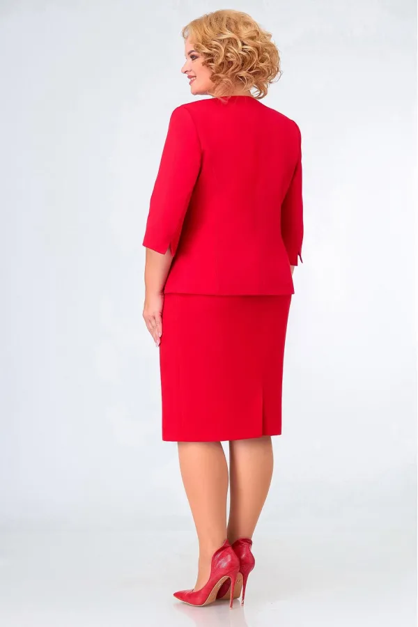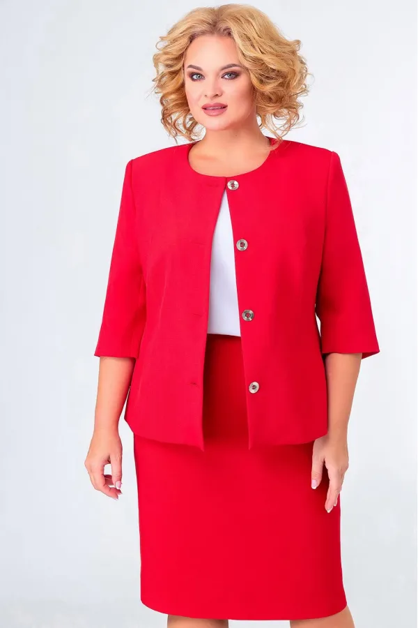 Комплект 2-х предметный, состоящий из жакета и юбки. Жакет однобортный на подкладке. По переду рельефы, по спинке средний шов. Рукав втачной двушовный ¾, по низу с разрезами. Застежка на 4 петли и пуговицы. Длина по спин... Читать далее...