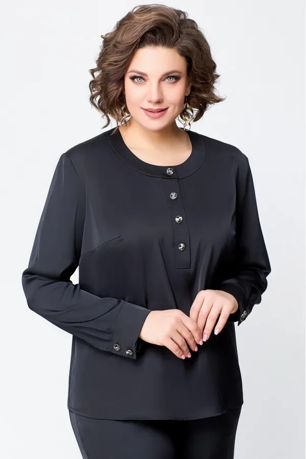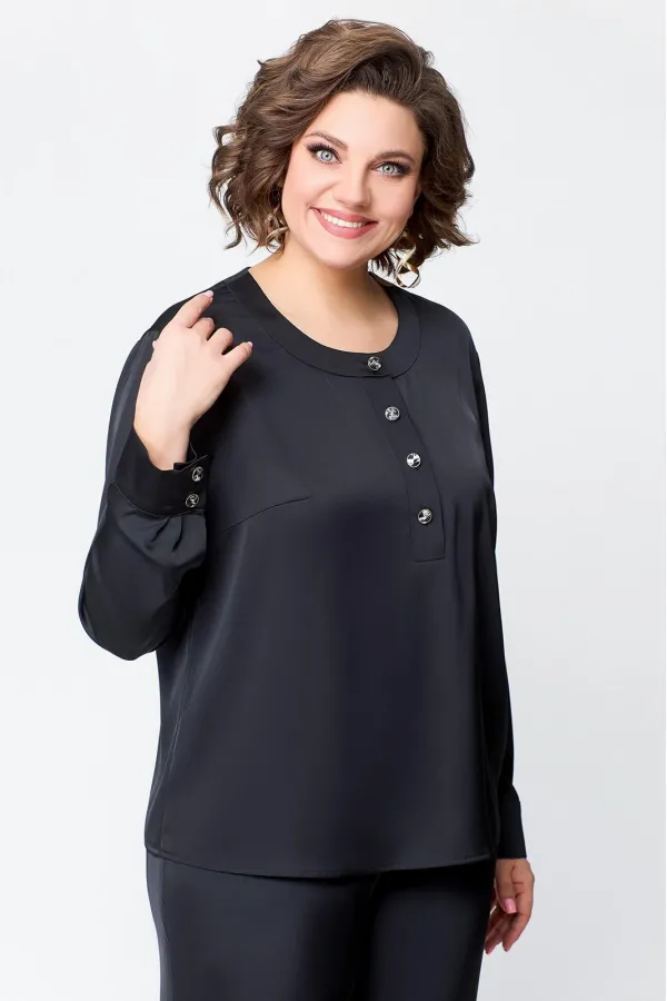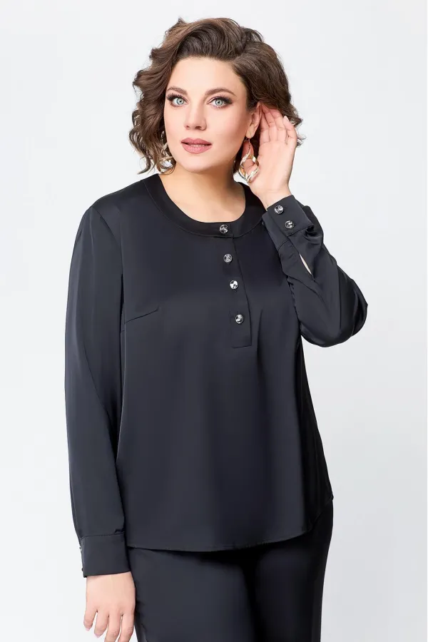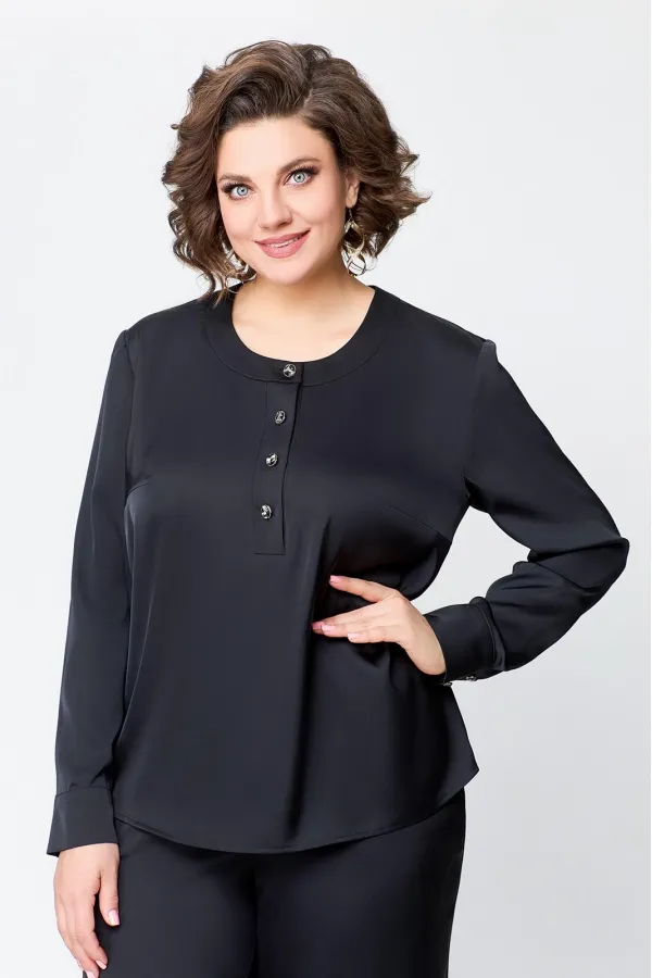 Блуза прямого силуэта, с застежкой «поло» на 4 петли и пуговицы на ножке. На полочке расположены нагрудные вытачки, выходящие из бокового шва.
