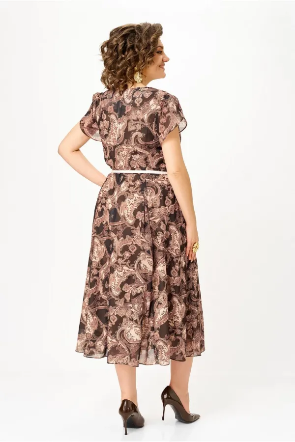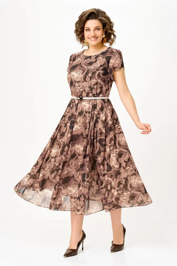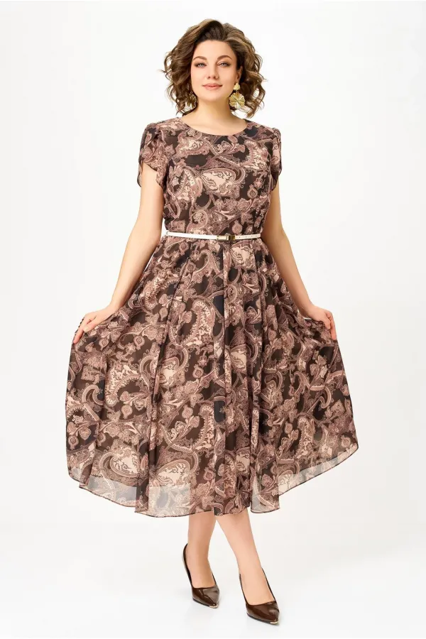 Х-образного силуэта с полуприлегающим лифом. Платье отрезное по линии талии. По переду лифа расположены рельефы, по спинке лифа талиевые вытачки. Юбка расклешённая из шести клиньев со встречными складками по линии талии. В среднем шве спинки застёжка на потайную тесьму-молнию. Рукав втачной, покроя тюльпан, длина рукава 15 см.