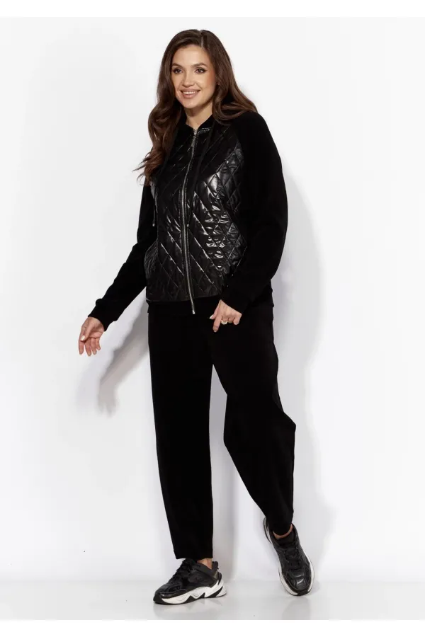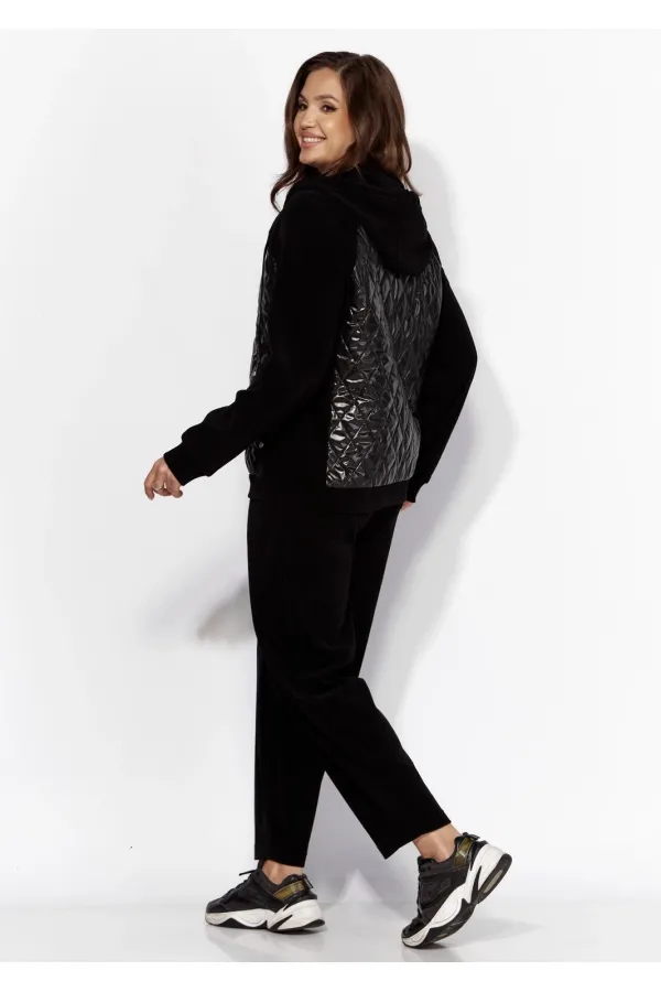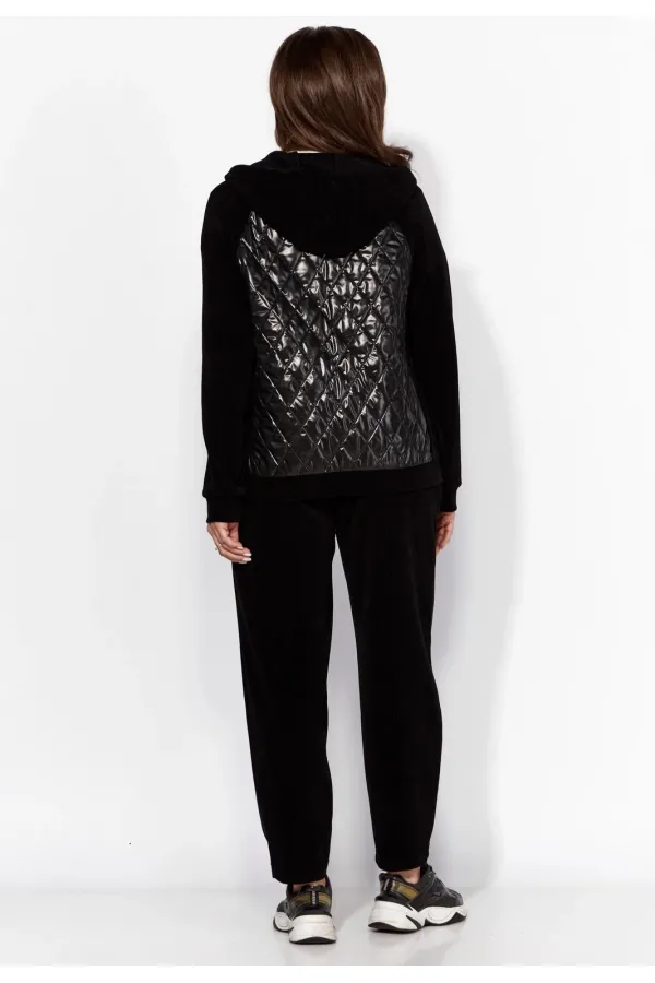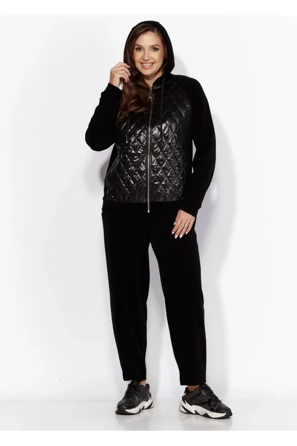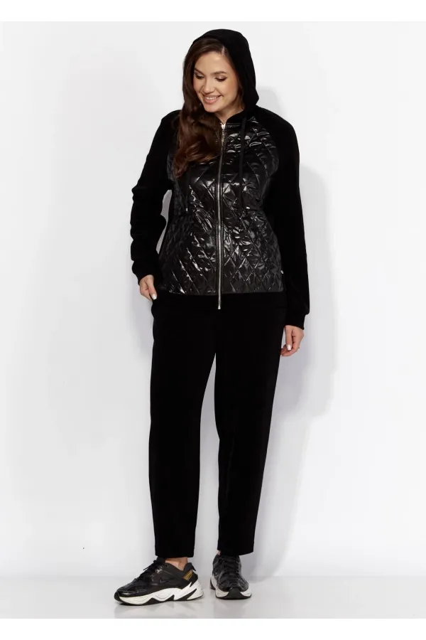 Комплект женский, 2хпредметный, состоящий из куртки и брюк. Куртка прямого силуэта с длинным рукавом. Рукав реглан с манжетой по низу. По переду и спинке рельефы из пройм. Спереди, в рельефах, карманы. Застежка центральная , на молнию. Горловина оформлена капюшоном с кулисой по краю. Низ куртки на манжете. Центральные детали переда и спинки из стежки (плащевка на синтепоне.) Брюки-слаксы, объемные, к низу зауженные. Карманы в боковых швах. Сзади накладной карман с декоративной нашивкой. Пояс цельнокройный, на резинке.